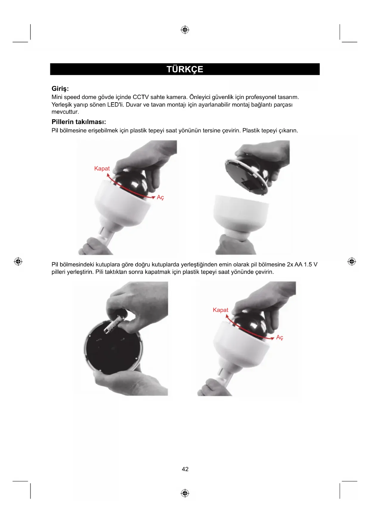 Sahte güvenlik kamerası Giriş: Mini speed dome gövde içinde CCTV sahte kamera. Önleyici güvenlik için profesyonel tasarım. Yerleşik yanıp sönen LED'li. Duvar ve tavan montajı için ayarlanabilir montaj bağlantı parçası mevcuttur. Pillerin takılması: Pil bölmesine erişebilmek için plastik tepeyi saat yönünün tersine çevirin. Plastik tepeyi çıkarın. Pil bölmesindeki kutuplara göre doğru kutuplarda yerleştiğinden emin olarak pil bölmesine 2x AA 1.5 V pilleri yerleştirin. Pili taktıktan sonra kapatmak için plastik tepeyi saat yönünde çevirin. Kapat