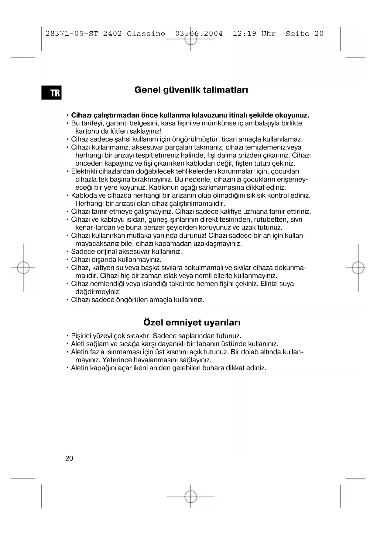 - Yüzeylerden kırıkları ve lekeleri siliniz. Bu cihaz, parazit giderici tekniği ve alçak voltaj emniyeti ile ilgili CE yönetmeliklere uygundur ve emniyet tekniğinin en yeni hükümlerine göre üretilmiştir. Teknik hususları değiştirme hakkı saklıdır. Garanti Cihazımız için satınalma tarihinden itibaren 12 aylık bir garanti üstleniyoruz (alışveriş fişi). Garanti süresi içerisinde, malzeme veya imal hatalarına dayanan cihaz noksanlıklarını tamiratla veya değiştirerek parasız bertaraf ediyoruz. Garanti, yabancı birinin müdahalesiyle sona erer. Garanti durumunda lütfen cihazı tam olarak alışveriş fişiyle birlikte satıcınıza veriniz. 28371-05-ST 2402 Classino 03.06.2004 12:19 Uhr Seite 21D-47906 Kempen/Germany · Industriering-Ost 40 Internet: http://www.clatronic.de · email: clatronic@t-online.de Technische Daten Modell: ST 2402 Classino Spannungsversorgung: 230 V, 50 Hz Leistungsaufnahme: 650 Watt Schutzklasse: Ι Dieses Gerät entspricht den CE-Richtlinien. Bitte führen Sie das ausgediente Gerät einer umweltgerechten Entsorgung zu. 28371-05-ST 2402 Classino 03.06.2004 12:19 Uhr Seite 22