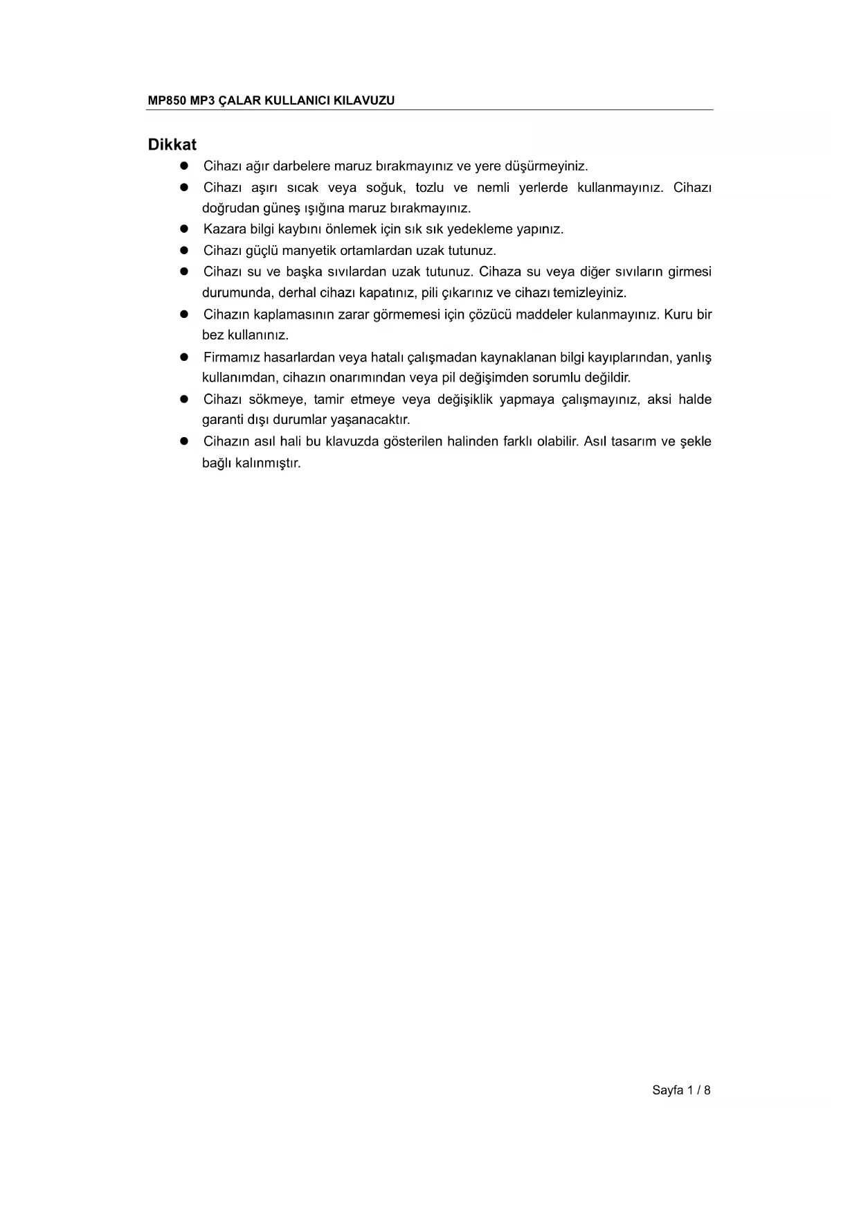 güncelleyiniz veya yenisini takınız.MP850 MP3 ÇALAR KULLANICI KILAVUZU Sayfa 7 / 8 Ekrandaki saat devamlı değişiyor. Çalma esnasında MP3 dosyasının bit oranı değişiyordur. MP3 dosyasını sıkıştırırken sabit bir bit oranı kullanınız. Cihazı takarken veya çıkarırken PC hata veriyor. Dosya aktarımı esnasında cihaz PC’den zamansız çıkarılmıştır. Dosya aktarımı esnasında cihazı PC’den çıkarmayınız. Cihazın görüntülediği belek durumu öngörülen miktardan farklı. Belleğin bir kısmı programları saklamada ve karakter görüntülemede kullanılıyordur. Bazı MP3 dosyaları düzgün çalışmıyor. MP3 dosyaları, mesela MPEG I Katman 1 veya Katman 2 gibi cihazın desteklemediği standartta sıkıştırılmıştır.