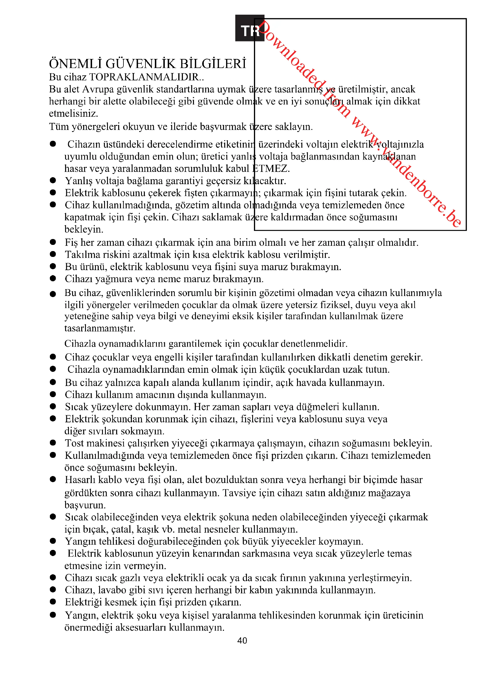 39Downloaded from www.vandenborre.be ÖNEMLø GÜVENLøK BøLGøLERø Bu cihaz TOPRAKLANMALIDIR.. Bu alet Avrupa güvenlik standartlarına uymak üzere tasarlanmıú ve üretilmiútir, ancak herhangi bir alette olabilece÷i gibi güvende olmak ve en iyi sonuçları almak için dikkat etmelisiniz. Tüm yönergeleri okuyun ve ileride baúvurmak üzere saklayın. z Cihazın üstündeki derecelendirme etiketinin üzerindeki voltajın elektrik voltajınızla uyumlu oldu÷undan emin olun; üretici yanlıú voltaja ba÷lanmasından kaynaklanan hasar veya yaralanmadan sorumluluk kabul ETMEZ. z Yanlıú voltaja ba÷lama garantiyi geçersiz kılacaktır. z Elektrik kablosunu çekerek fiúten çıkarmayın; çıkarmak için fiúini tutarak çekin. z Cihaz kullanılmadı÷ında, gözetim altında olmadı÷ında veya temizlemeden önce kapatmak için fiúi çekin. Cihazı saklamak üzere kaldırmadan önce so÷umasını bekleyin. z Fiú her zaman cihazı çıkarmak için ana birim olmalı ve her zaman çalıúır olmalıdır. z Takılma riskini azaltmak için kısa elektrik kablosu verilmiútir. z Bu ürünü, elektrik kablosunu veya fiúini suya maruz bırakmayın. z Cihazı ya÷mura veya neme maruz bırakmayın.