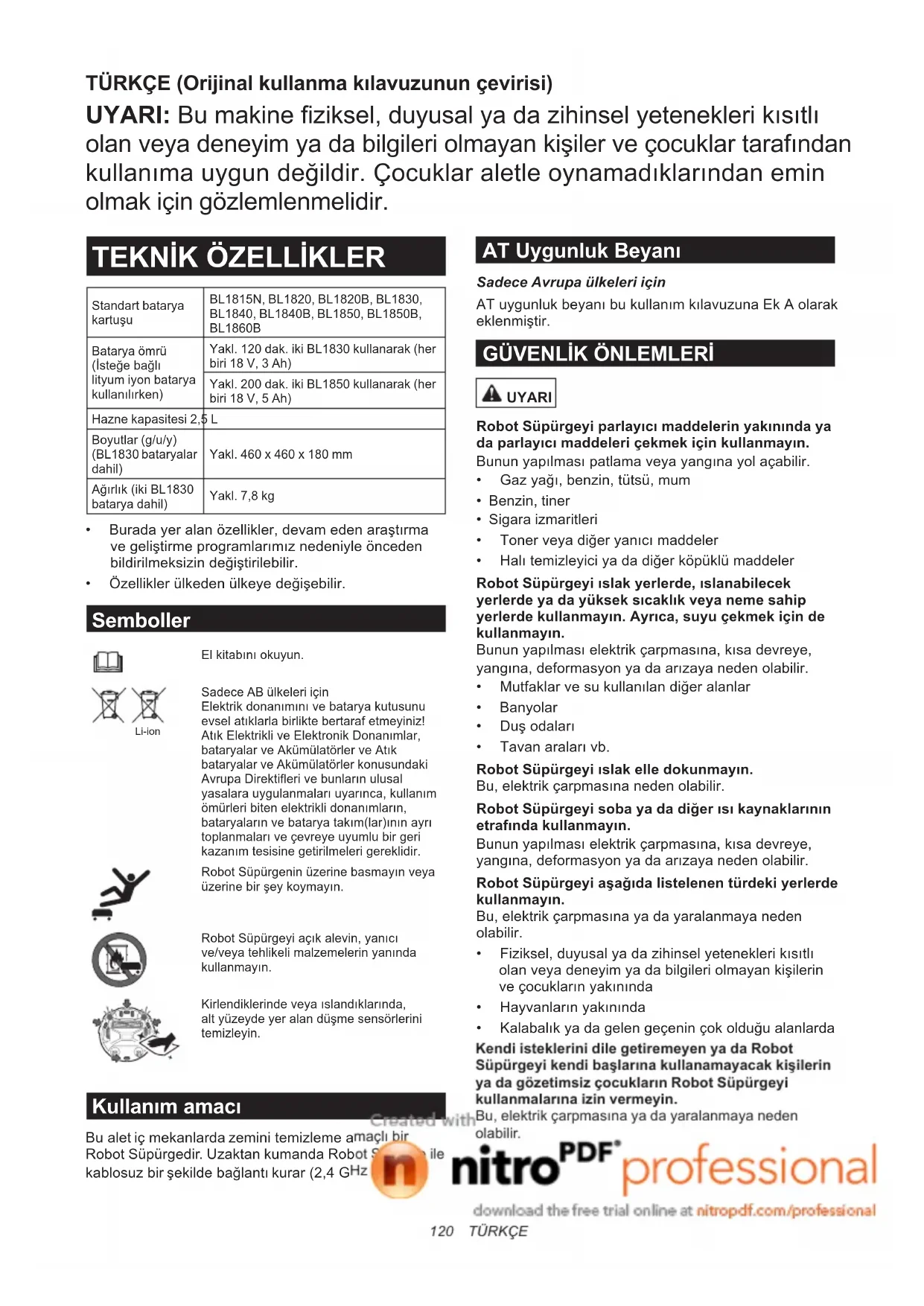 - Özelliklerülkedenülkeyedeğişebilir. Semboller Elkitabınıokuyun. Li-ion Sadece AB ülkeleri için Elektrikdonanımınıvebataryakutusunu evselatıklarlabirliktebertarafetmeyiniz! AtıkElektrikliveElektronikDonanımlar, bataryalarveAkümülatörlerveAtık bataryalar ve Akümülatörler konusundaki AvrupaDirektierivebunlarınulusal yasalarauygulanmalarıuyarınca,kullanım ömürleribitenelektriklidonanımların, bataryalarınvebataryatakım(lar)ınınayrı toplanmalarıveçevreyeuyumlubirgeri kazanımtesisinegetirilmelerigereklidir. RobotSüpürgeninüzerinebasmayınveya üzerinebirşeykoymayın. RobotSüpürgeyiaçıkalevin,yanıcı ve/veyatehlikelimalzemelerinyanında kullanmayın. Kirlendiklerindeveyaıslandıklarında, altyüzeydeyeralandüşmesensörlerini temizleyin. Kullanım amacı Bualetiçmekanlardazeminitemizlemeamaçlıbir Robot Süpürgedir. Uzaktan kumanda Robot Süpürge ile kablosuzbirşekildebağlantıkurar(2,4GHzZigBee). TÜRKÇE (Orijinal kullanma kılavuzunun çevirisi) UYARI: Bumakineziksel,duyusalyadazihinselyeteneklerikısıtlı olanveyadeneyimyadabilgileriolmayankişilerveçocuklartarafından kullanımauygundeğildir.Çocuklaraletleoynamadıklarındanemin olmak için gözlemlenmelidir. AT Uygunluk Beyanı Sadece Avrupa ülkeleri için ATuygunlukbeyanıbukullanımkılavuzunaEkAolarak eklenmiştir.