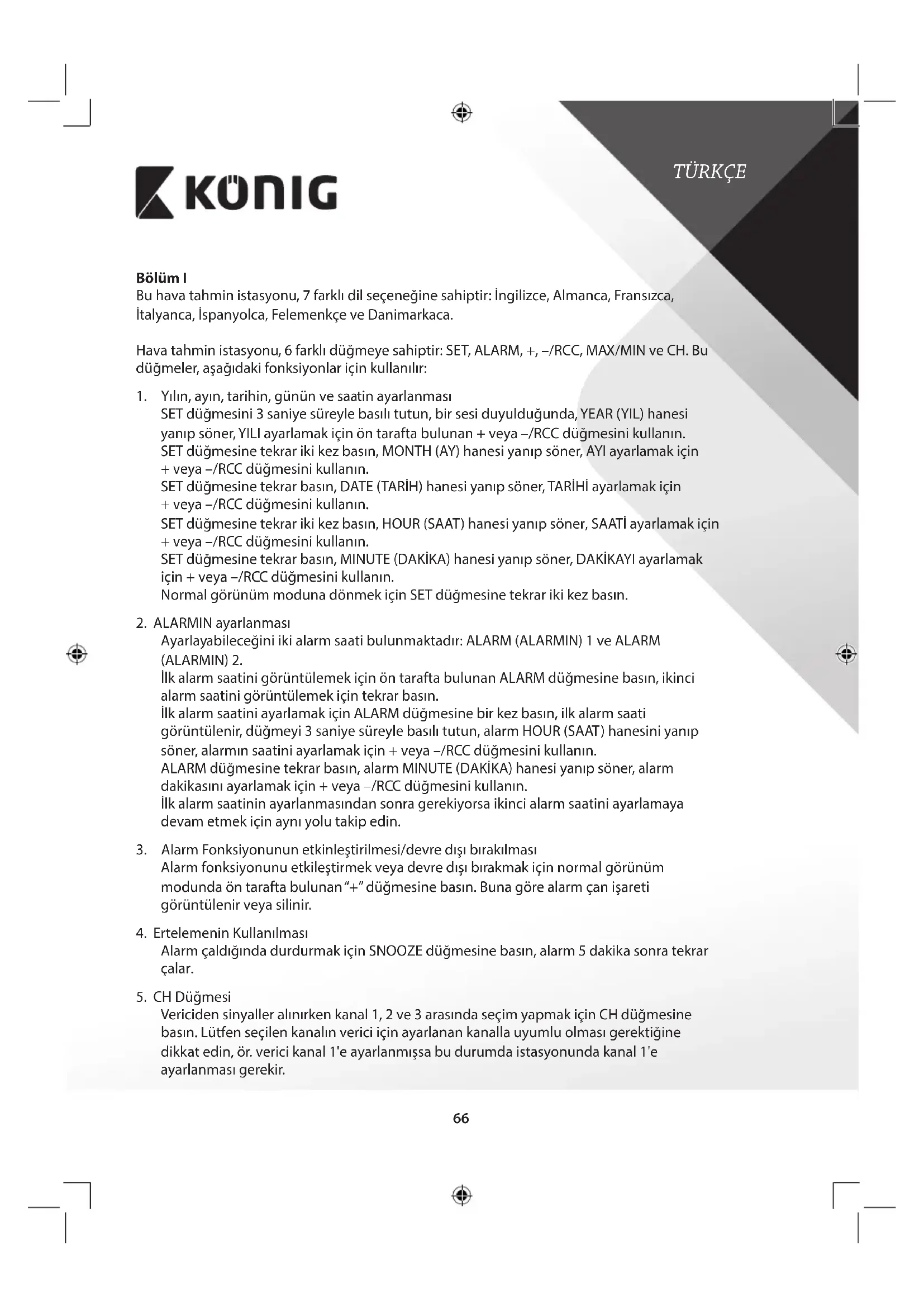 Bölüm I Bu hava tahmin istasyonu, 7 farklı dil seçeneğine sahiptir: İngilizce, Almanca, Fransızca, İtalyanca, İspanyolca, Felemenkçe ve Danimarkaca. Hava tahmin istasyonu, 6 farklı düğmeye sahiptir: SET, ALARM, +, –/RCC, MAX/MIN ve CH. Bu düğmeler, aşağıdaki fonksiyonlar için kullanılır: