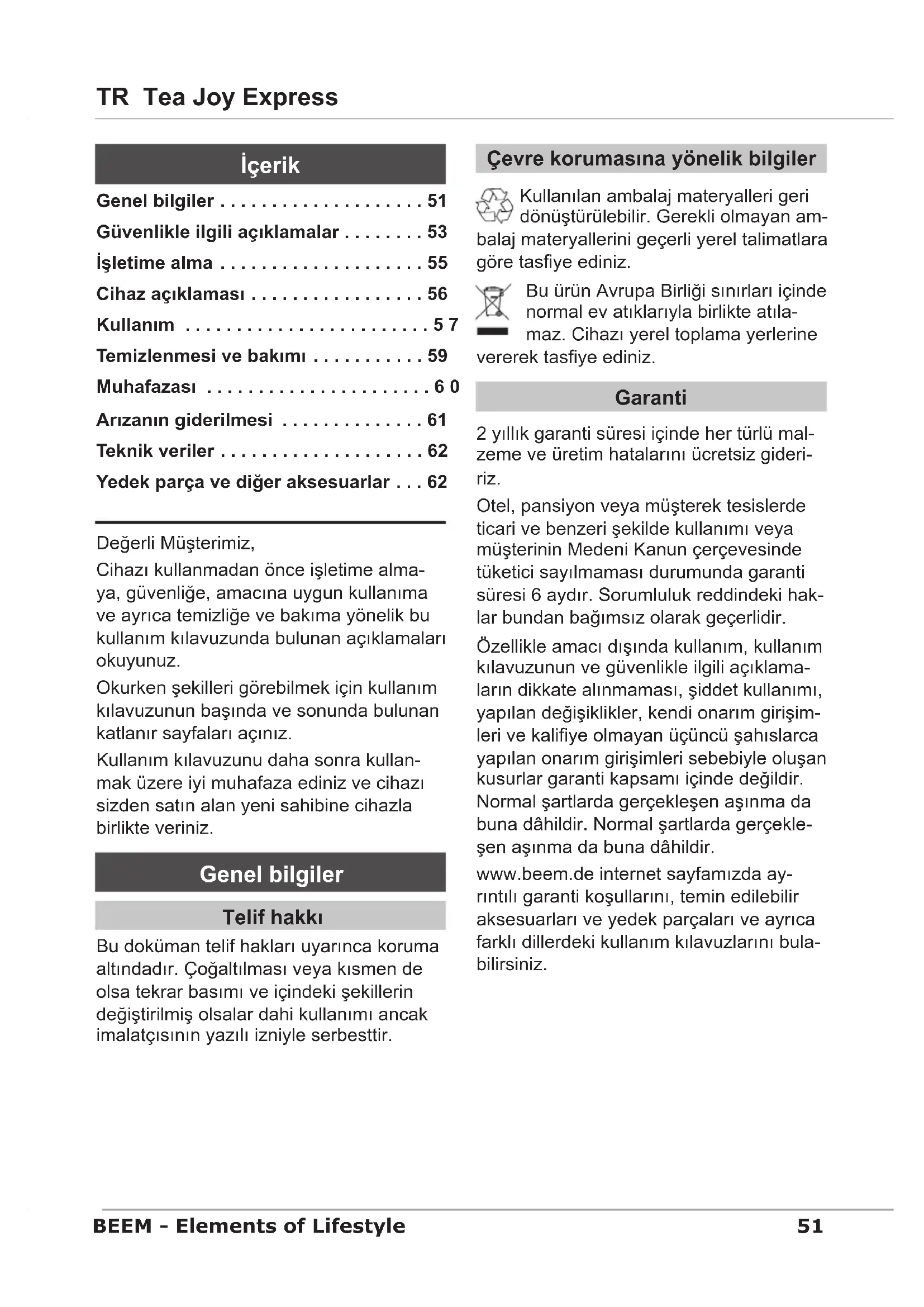 - conform schets in de beschrijving van het apparaat51 TR Tea Joy Express BEEM - Elements of Lifestyle Değerli Müşterimiz, Cihazı kullanmadan önce işletime alma- ya, güvenliğe, amacına uygun kullanıma ve ayrıca temizliğe ve bakıma yönelik bu kullanım kılavuzunda bulunan açıklamaları okuyunuz. Okurken şekilleri görebilmek için kullanım kılavuzunun başında ve sonunda bulunan katlanır sayfaları açınız. Kullanım kılavuzunu daha sonra kullan- mak üzere iyi muhafaza ediniz ve cihazı sizden satın alan yeni sahibine cihazla birlikte veriniz. Genel bilgiler Telif hakkı Bu doküman telif hakları uyarınca koruma altındadır. Çoğaltılması veya kısmen de olsa tekrar basımı ve içindeki şekillerin değiştirilmiş olsalar dahi kullanımı ancak imalatçısının yazılı izniyle serbesttir. Çevre korumasına yönelik bilgiler Kullanılan ambalaj materyalleri geri dönüştürülebilir. Gerekli olmayan am- balaj materyallerini geçerli yerel talimatlara göre tasye ediniz. Bu ürün Avrupa Birliği sınırları içinde normal ev atıklarıyla birlikte atıla- maz. Cihazı yerel toplama yerlerine vererek tasye ediniz. Garanti 2 yıllık garanti süresi içinde her türlü mal- zeme ve üretim hatalarını ücretsiz gideri- riz. Otel, pansiyon veya müşterek tesislerde ticari ve benzeri şekilde kullanımı veya müşterinin Medeni Kanun çerçevesinde tüketici sayılmaması durumunda garanti süresi 6 aydır. Sorumluluk reddindeki hak- lar bundan bağımsız olarak geçerlidir. Özellikle amacı dışında kullanım, kullanım kılavuzunun ve güvenlikle ilgili açıklama- ların dikkate alınmaması, şiddet kullanımı, yapılan değişiklikler, kendi onarım girişim- leri ve kaliye olmayan üçüncü şahıslarca yapılan onarım girişimleri sebebiyle oluşan kusurlar garanti kapsamı içinde değildir. Normal şartlarda gerçekleşen aşınma da buna dâhildir. Normal şartlarda gerçekle- şen aşınma da buna dâhildir. www.beem.de internet sayfamızda ay- rıntılı garanti koşullarını, temin edilebilir aksesuarları ve yedek parçaları ve ayrıca farklı dillerdeki kullanım kılavuzlarını bula- bilirsiniz. Genel bilgiler . . . . . . . . . . . . . . . . . . . . 51 Güvenlikle ilgili açıklamalar . . . . . . . . 53 İşletime alma . . . . . . . . . . . . . . . . . . . . 55 Cihaz açıklaması . . . . . . . . . . . . . . . . . 56 Kullanım ........................57 Temizlenmesi ve bakımı . . . . . . . . . . . 59 Muhafazası ......................60 Arızanın giderilmesi . . . . . . . . . . . . . . 61 Teknik veriler . . . . . . . . . . . . . . . . . . . . 62 Yedek parça ve diğer aksesuarlar . . . 62 İçerik52 Tea Joy Express TR BEEM - Elements of Lifestyle UYARI Bu cihazdan amacına uygun olmayan kullanımı ve/veya farklı kullanımı nede- niyle tehlike doğabilir. Cihazı yalnızca amacına uygun ► olarak kullanınız. Bu kılavuzda tarif edilen yöntemlere ► uyunuz. Amacına uygun olmayan kullanımdan kay- naklanan hasar nedeniyle herhangi bir hak talebinde bulunmak mümkün değildir. Risk sadece cihazı çalıştırana aittir. Ticari amaçla kullanılması durumunda garanti süresindeki değişimi göz önünde bulundurunuz. Sorumluluk sınırlaması Bu kullanım kılavuzunun içinde bulunan ve tüm teknik bilgi, veri ve açıklamalar baskı esnasında geçerli olan en güncel seviye ile uyum içindedir. Bu kılavuzda kullanılan açıklama, şekil ve tanımlamalardan yola çıkarak hiçbir hak iddia edilemez. Üretici, kılavuza uymama, amacının dışın- da kullanım, uzman tarafından yapılmayan onarım ve cihaz üzerinde izinsiz değişiklik veya izinsiz yedek parça ve / veya kulla- nım materyallerinin kullanımı sebebiyle oluşan hasarlardan dolayı sorumluluk üstlenmez. Uygunluk beyanı İşbu yazıyla BEEM rması, 2006/95/AB ve 2004/108/AB yönergelerinin temel talepleri ve diğer geçerli düzenlemeleriyle uygun olduğunu beyan eder. Uygunluk beyanının tamamını www.beem.de adresinde bula- bilirsiniz. Kullanılan semboller TEHLİKE Ağır vücut yaralanmalarına veya ölüme neden olan doğrudan tehlikeler için kullanılır. Önlemek için burada belirtilen tali- ► matlara uyun. UYARI Ağır vücut yaralanmalarına veya ölüme neden olabilecek olası tehlikeli bir durum için kullanılır. Önlemek için burada belirtilen tali- ► matlara uyun. DİKKAT Haf yaralanmalara veya maddi hasara neden olabilecek olası tehlikeli bir durum için kullanılır. Önlemek için burada belirtilen tali- ► matlara uyun. BİLGİ Bilgi işareti cihazın kullanımını kolay- ► laştıran ek bilgilere işaret eder. Amacına uygun kullanım Bu cihaz sadece ticari olmayan kullanımlar için kapalı odalarda suyun ısıtılması ve çayın hazırlanması içindir. Bunun dışında veya bu sınırları aşan kul- lanım, amacına uygun olmayan kullanım olarak değerlendirilir.53 TR Tea Joy Express BEEM - Elements of Lifestyle Güvenlikle ilgili açıklamalar Cihazı kullanmaya başlamadan önce ■ dış etkenli görünür hasar olup olma- dığını kontrol ediniz. Hasarlı bir cihazı çalıştırmayınız. Çocukların bu cihazla oynamalarına ■ kesinlikle izin verilmemelidir. Cihaz çalışırken yanından ayrılmayınız. ■ Bağlantı kablosunu her zaman şebeke ■ şinden tutarak prizden çekiniz, bağ- lantı kablosundan çekmeyiniz. Bedensel, zihinsel ya da motorik bece- ■ rilerinden dolayı cihazı güvenli biçimde kullanabilme konumunda olmayan kişiler, cihazı sadece gözetim altında veya sorumlu bir kişinin talimatıyla kul- lanabilirler. Cihazda onarımları sadece yetkili ■ uzman satıcılar veya fabrika müşteri servisi tarafından yapılmasını sağlayın, bu özellikle hasarlı bir bağlantı kab- losunun değiştirilmesi için geçerlidir. Uzman tarafından yapılmayan onarım, kullananlar için büyük tehlikeler oluştu- rabilir. Buna ek olarak garanti hakkınız da sona ermiş olur.