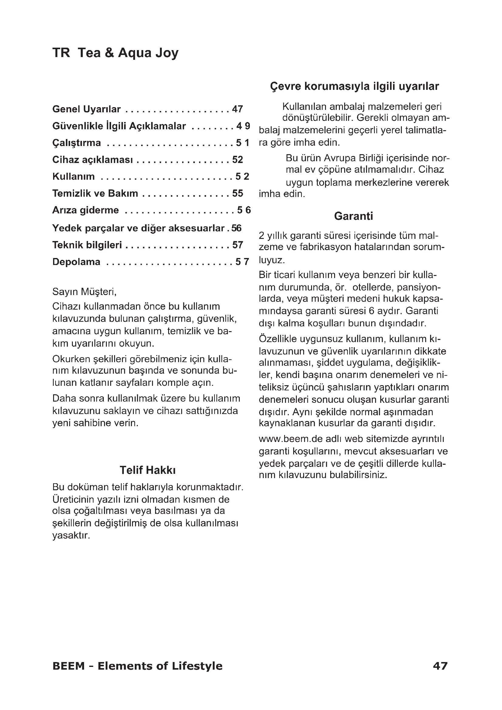 - conform schets in de beschrijving van het apparaat46 Tea & Aqua Joy NL BEEM - Elements of Lifestyle Technische gegevens Model Samowar / water- & theeketelset Tea & Aqua Joy Typenummer W12.001 Vulhoeveelheid waterketel 1,5 l Vulhoeveelheid theepot 0,7 l Bedrijfsspanning 220-240 VAC Netfrequentie 50 Hz Vermogensopname 1580-1880 W / 80 W Afmetingen (H x B x D) 50 x 40 x 41 cm Gewicht ca. 1,4 kg Beschermingsklasse I Opslag Wanneer u het apparaat gedurende een langere periode niet nodig heeft, maak het dan leeg en reinig het als beschreven in het hoofdstuk Reiniging en verzorging. Bewaar het apparaat op een droge, scho- ne en vorstvrije plek, waar het beschermd is tegen direct zonlicht.47 TR Tea & Aqua Joy BEEM - Elements of Lifestyle Sayın Müşteri, Cihazı kullanmadan önce bu kullanım kılavuzunda bulunan çalıştırma, güvenlik, amacına uygun kullanım, temizlik ve ba- kım uyarılarını okuyun. Okurken şekilleri görebilmeniz için kulla- nım kılavuzunun başında ve sonunda bu- lunan katlanır sayfaları komple açın. Daha sonra kullanılmak üzere bu kullanım kılavuzunu saklayın ve cihazı sattığınızda yeni sahibine verin. Genel Uyarılar Telif Hakkı Bu doküman telif haklarıyla korunmaktadır. Üreticinin yazılı izni olmadan kısmen de olsa çoğaltılması veya basılması ya da şekillerin değiştirilmiş de olsa kullanılması yasaktır. Çevre korumasıyla ilgili uyarılar Kullanılan ambalaj malzemeleri geri dönüştürülebilir. Gerekli olmayan am- balaj malzemelerini geçerli yerel talimatla- ra göre imha edin. Bu ürün Avrupa Birliği içerisinde nor- mal ev çöpüne atılmamalıdır. Cihaz uygun toplama merkezlerine vererek imha edin. Garanti 2 yıllık garanti süresi içerisinde tüm mal- zeme ve fabrikasyon hatalarından sorum- luyuz. Bir ticari kullanım veya benzeri bir kulla- nım durumunda, ör. otellerde, pansiyon- larda, veya müşteri medeni hukuk kapsa- mındaysa garanti süresi 6 aydır. Garanti dışı kalma koşulları bunun dışındadır. Özellikle uygunsuz kullanım, kullanım kı- lavuzunun ve güvenlik uyarılarının dikkate alınmaması, şiddet uygulama, değişiklik- ler, kendi başına onarım denemeleri ve ni- teliksiz üçüncü şahısların yaptıkları onarım denemeleri sonucu oluşan kusurlar garanti dışıdır. Aynı şekilde normal aşınmadan kaynaklanan kusurlar da garanti dışıdır. www.beem.de adlı web sitemizde ayrıntılı garanti koşullarını, mevcut aksesuarları ve yedek parçaları ve de çeşitli dillerde kulla- nım kılavuzunu bulabilirsiniz. Genel Uyarılar . . . . . . . . . . . . . . . . . . . 47 Güvenlikle İlgili Açıklamalar ........49 Çalıştırma .......................51 Cihaz açıklaması . . . . . . . . . . . . . . . . . 52 Kullanım ........................52 Temizlik ve Bakım . . . . . . . . . . . . . . . . 55 Arıza giderme ....................56 Yedek parçalar ve diğer aksesuarlar . 56 Teknik bilgileri . . . . . . . . . . . . . . . . . . . 57 Depolama .......................57 İçindekiler48 Tea & Aqua Joy TR BEEM - Elements of Lifestyle UYARI Bu cihazdan amacına uygun olmayan kullanımı ve/veya farklı kullanımı nede- niyle tehlike doğabilir. Cihazı yalnızca amacına uygun ► olarak kullanınız. Bu kılavuzda tarif edilen yöntemlere ► uyunuz. Amacına uygun olmayan kullanımdan kay- naklanan hasar nedeniyle herhangi bir hak talebinde bulunmak mümkün değildir. Risk sadece cihazı çalıştırana aittir. Ticari olarak kullandığınızda garanti süre- sinin değiştiğine dikkat edin. Sınırlı sorumluluk Bu kullanım kılavuzunda mevcut tüm teknik bilgiler ve uyarılar en güncel baskı bilgilerine dayanır. Bu kılavuzda kullanılan açıklama, şekil ve tanımlamalardan yola çıkarak hiçbir hak iddia edilemez. Kılavuzun dikkate alınmaması, uygunsuz onarım, izinsiz yapılan değişiklikler veya izin verilmeyen yedek parçaların ve/veya sarf malzemelerinin kullanılması sonucu oluşan hasarlardan üretici sorumlu değil- dir. Uygunluk beyanı İşbu belgeyle BEEM rması, bu cihazın 2006/95/AB ve 2004/108/AB sayılı yö- nergelerdeki taleplere ve diğer ilgili dü- zenlemelere uygun olduğunu beyan eder. Eksiksiz bir uygunluk beyanını www.beem. de altında bulabilirsiniz. Kullanılan semboller TEHLİKE Ağır yaralanmalara veya ölüme neden olan doğrudan bir tehlike için kullanılır. Riski önlemek için burada belirtilen ► talimatlara riayet edin. UYARI Ağır yaralanmalara veya ölüme neden olabilen olası bir tehlikeli durum için kullanılır. Riski önlemek için burada belirtilen ► talimatlara riayet edin. DİKKAT Haf yaralanmalara veya maddi hasar- lara neden olabilen olası bir tehlikeli durum için kullanılır. Riski önlemek için burada belirtilen ► talimatlara riayet edin. BİLGİ Bilgi işareti cihazın kullanımını kolay- ► laştıran ek bilgilere işaret eder. Amacına Uygun Kullanım Bu cihaz yalnızca kapalı mekanlarda su ısıtmaya ve çay hazırlamaya yarar ve tica- ri kullanım için öngörülmemiştir. Bunun dışında veya bu sınırları aşan kul- lanım, amacına uygun olmayan kullanım olarak değerlendirilir.49 TR Tea & Aqua Joy BEEM - Elements of Lifestyle Güvenlikle İlgili Açıklamalar Cihazı kullanmadan önce gözle görülür ■ dış hasarlar bakımından kontrol edin. Hasarlı bir cihazı asla çalıştırmayın. Cihazla oynamamalarını sağlamak için ■ çocukları başı boş bırakmamalısınız. Cihazı çalışma esnasında kontrolsüz ■ bırakmayın. Elektrik kablosunu her zaman şten ■ çekerek prizden çıkarın, kablodan asla çekmeyin. Bedensel veya ruhsal engellerinden ■ dolayı cihazı güvenle çalıştıracak du- rumda olmayan kişiler cihazı yalnızca sorumlu bir kişinin gözetiminde kulla- nabilir. Cihazdaki onarımları yetkili servise ■ veya müşteri hizmetlerine yaptırın; bu husus özellikle hasarlı bağlantı kablo- sunun değiştirilmesi için geçerli