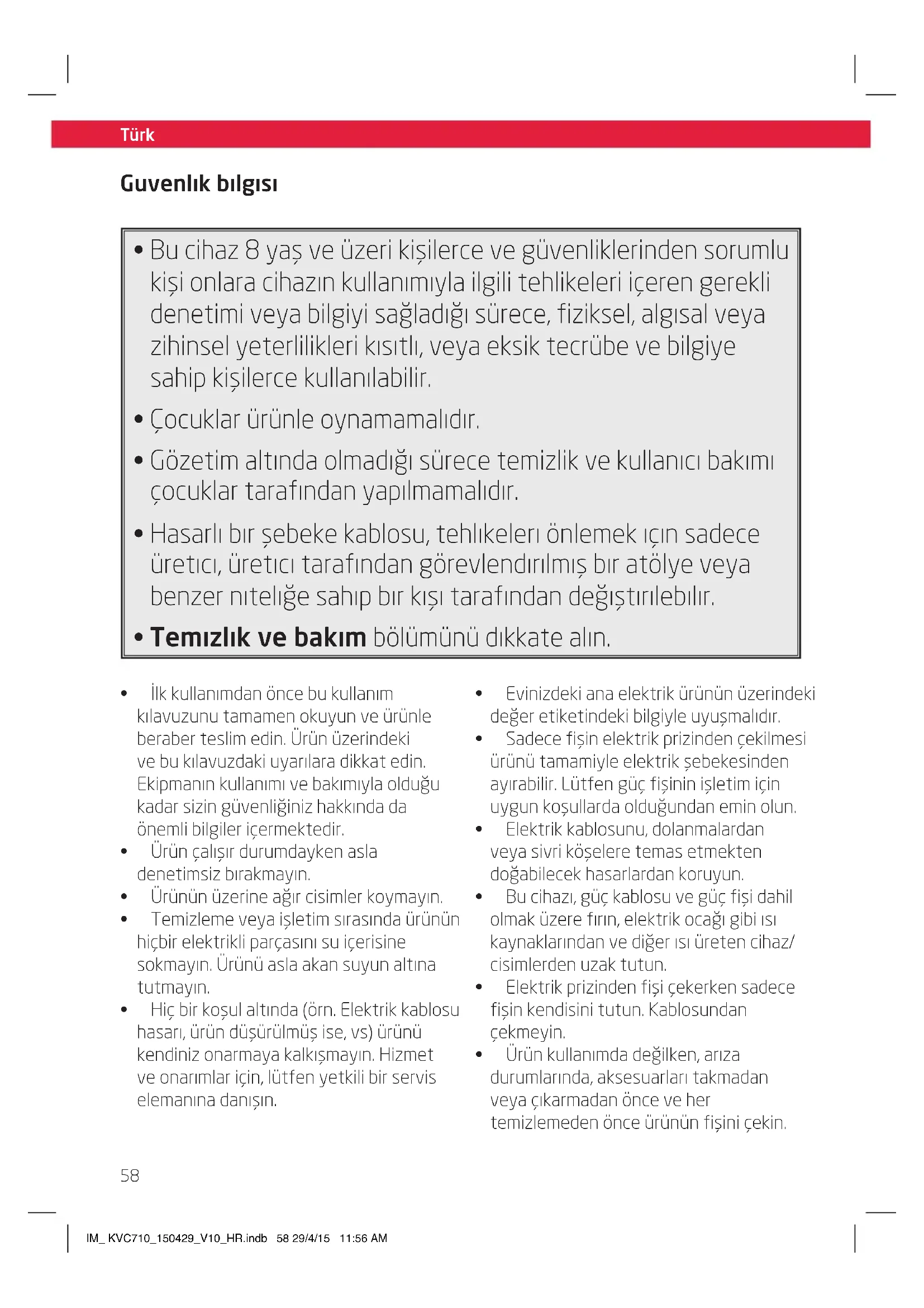 - Temızlık ve bakım bölümünü dıkkate alın. Guvenlık bılgısı