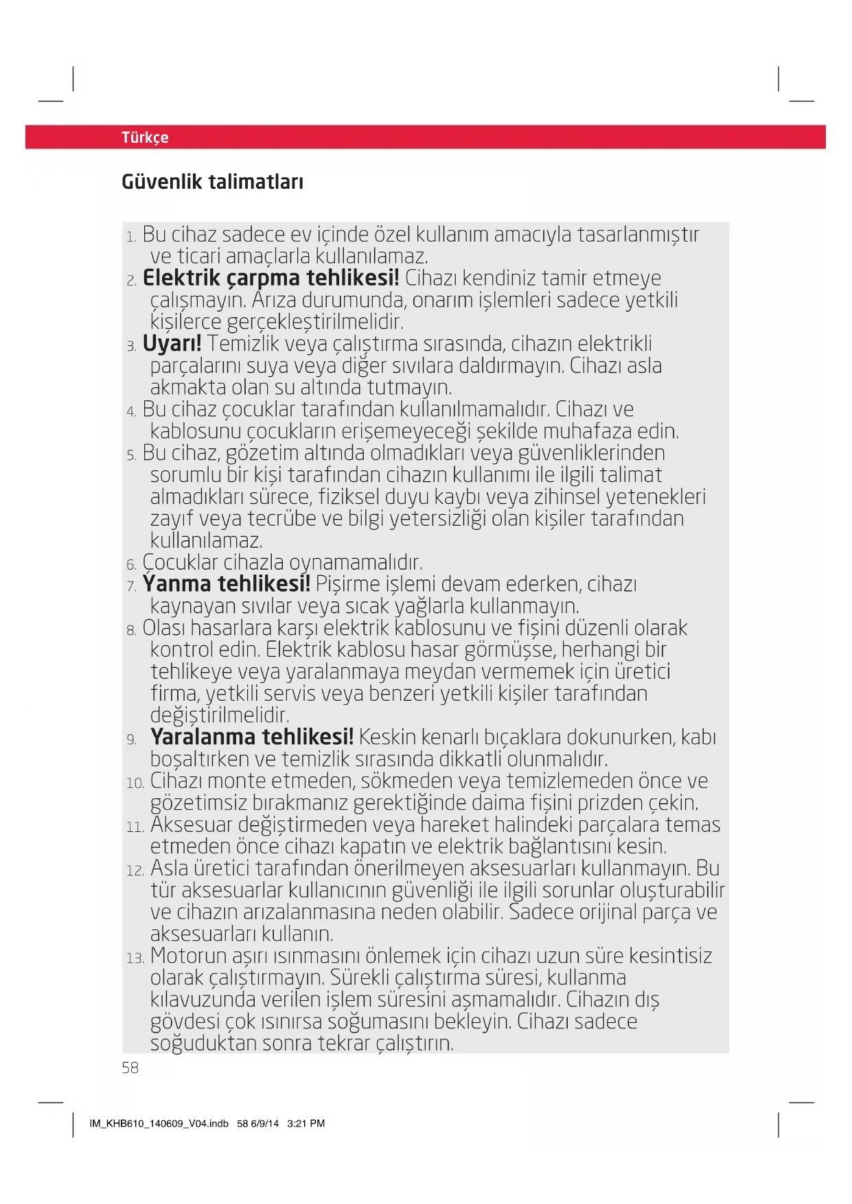 olarak çalıştırmayın. Sürekli çalıştırma süresi, kullanma kılavuzunda verilen işlem süresini aşmamalıdır. Cihazın dış gövdesi çok ısınırsa soğumasını bekleyin. Cihazı sadece soğuduktan sonra tekrar çalıştırın. IM_KHB610_140609_V04.indb 58 6/9/14 3:21 PM59 Türkçe Güvenlik talimatları