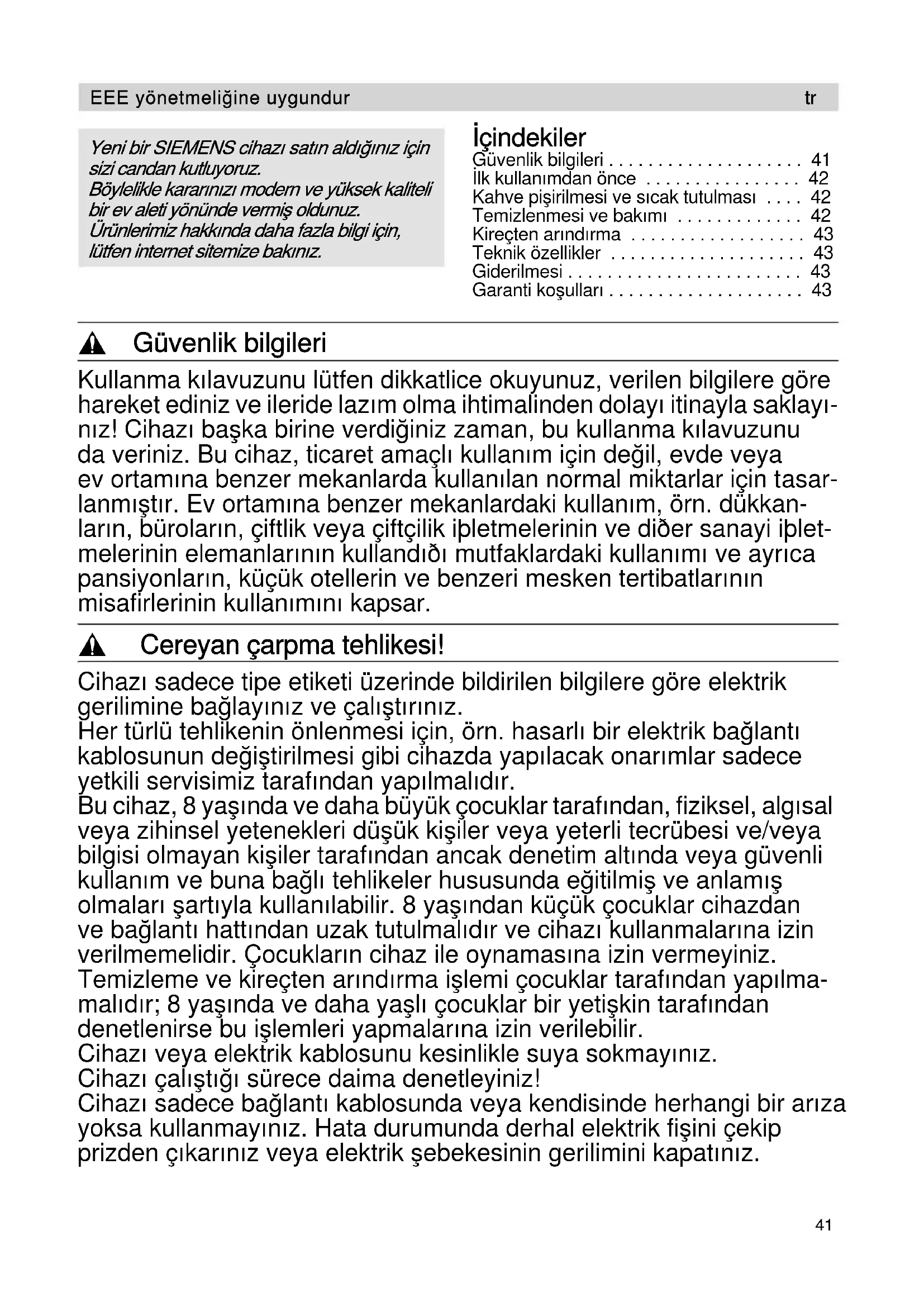 - Garanti koşulları , Güvenlik bilgileri Kullanma kılavuzunu lütfen dikkatlice okuyunuz, verilen bilgilere göre hareket ediniz ve ileride lazım olma ihtimalinden dolayı itinayla saklayı- nız! Cihazı başka birine verdiğiniz zaman, bu kullanma kılavuzunu da veriniz. Bu cihaz, ticaret amaçlı kullanım için değil, evde veya ev ortamına benzer mekanlarda kullanılan normal miktarlar için tasar- lanmıştır. Ev ortamına benzer mekanlardaki kullanım, örn. dükkan- ların, büroların, çiftlik veya çiftçilik iþletmelerinin ve diðer sanayi iþlet- melerinin elemanlarının kullandıðı mutfaklardaki kullanımı ve ayrıca pansiyonların, küçük otellerin ve benzeri mesken tertibatlarının misafirlerinin kullanımını kapsar. , Cereyan çarpma tehlikesi! Cihazı sadece tipe etiketi üzerinde bildirilen bilgilere göre elektrik gerilimine bağlayınız ve çalıştırınız. Her türlü tehlikenin önlenmesi için, örn. hasarlı bir elektrik bağlantı kablosunun değiştirilmesi gibi cihazda yapılacak onarımlar sadece yetkili servisimiz tarafından yapılmalıdır. Bu cihaz, 8 yaşında ve daha büyük çocuklar tarafından, fiziksel, algısal veya zihinsel yetenekleri düşük kişiler veya yeterli tecrübesi ve/veya bilgisi olmayan kişiler tarafından ancak denetim altında veya güvenli kullanım ve buna bağlı tehlikeler hususunda eğitilmiş ve anlamış olmaları şartıyla kullanılabilir. 8 yaşından küçük çocuklar cihazdan ve bağlantı hattından uzak tutulmalıdır ve cihazı kullanmalarına izin verilmemelidir. Çocukların cihaz ile oynamasına izin vermeyiniz. Temizleme ve kireçten arındırma işlemi çocuklar tarafından yapılma- malıdır; 8 yaşında ve daha yaşlı çocuklar bir yetişkin tarafından denetlenirse bu işlemleri yapmalarına izin verilebilir. Cihazı veya elektrik kablosunu kesinlikle suya sokmayınız. Cihazı çalıştığı sürece daima denetleyiniz! Cihazı sadece bağlantı kablosunda veya kendisinde herhangi bir arıza yoksa kullanmayınız. Hata durumunda derhal elektrik fişini çekip prizden çıkarınız veya elektrik şebekesinin gerilimini kapatınız. p. 43