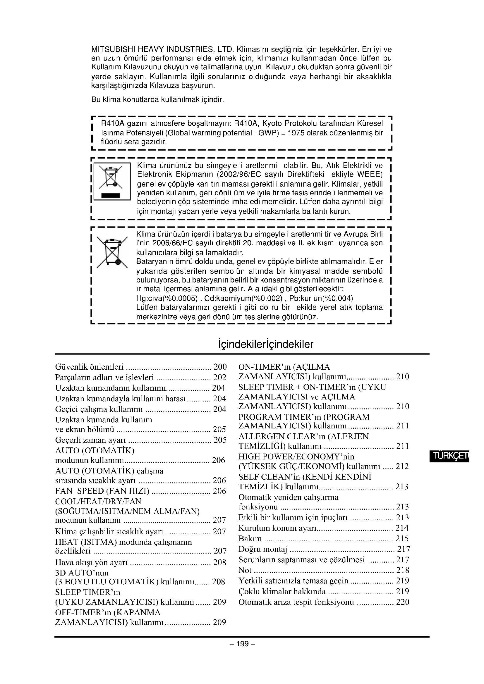 - Klima ürününüz bu simgeyle i aretlenmi olabilir. Bu, Atık Elektrikli ve Elektronik Ekipmanın (2002/96/EC sayılı Direktifteki ekliyle WEEE) genel ev çöpüyle karı tırılmaması gerekti i anlamına gelir. Klimalar, yetkili yeniden kullanım, geri dönü üm ve iyile tirme tesislerinde i lenmemeli ve belediyenin çöp sisteminde imha edilmemelidir. Lütfen daha ayrıntılı bilgi için montajı yapan yerle veya yetkili makamlarla ba lantı kurun. Klima ürünüzün içerdi i batarya bu simgeyle i aretlenmi tir ve Avrupa Birli i’nin 2006/66/EC sayılı direktifi 20. maddesi ve II. ek kısmı uyarınca son kullanıcılara bilgi sa lamaktadır. Bataryanın ömrü doldu unda, genel ev çöpüyle birlikte atılmamalıdır. E er yukarıda gösterilen sembolün altında bir kimyasal madde sembolü bulunuyorsa, bu bataryanın belirli bir konsantrasyon miktarının üzerinde a ır metal içermesi anlamına gelir. A a ıdaki gibi gösterilecektir: Hg:cıva(%0.0005) , Cd:kadmiyum(%0.002) , Pb:kur un(%0.004) Lütfen bataryalarınızı gerekti i gibi do ru bir ekilde yerel atık toplama merkezinize veya geri dönü üm tesislerine götürünüz. Güvenlik önlemleri p. 200