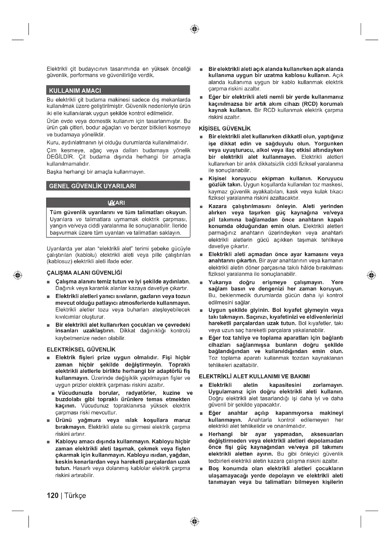 UYARI Tüm güvenlik uyarılarını ve tüm talimatları okuyun. Uyarılara ve talimatlara uymamak elektrik çarpması, yangın ve/veya ciddi yaralanma ile sonuçlanabilir. İleride başvurmak üzere tüm uyarıları ve talimatları saklayın. Uyarılarda yer alan “elektrikli alet” terimi şebeke gücüyle çalıştırılan (kablolu) elektrikli aleti veya pille çalıştırılan (kablosuz) elektrikli aleti ifade eder.