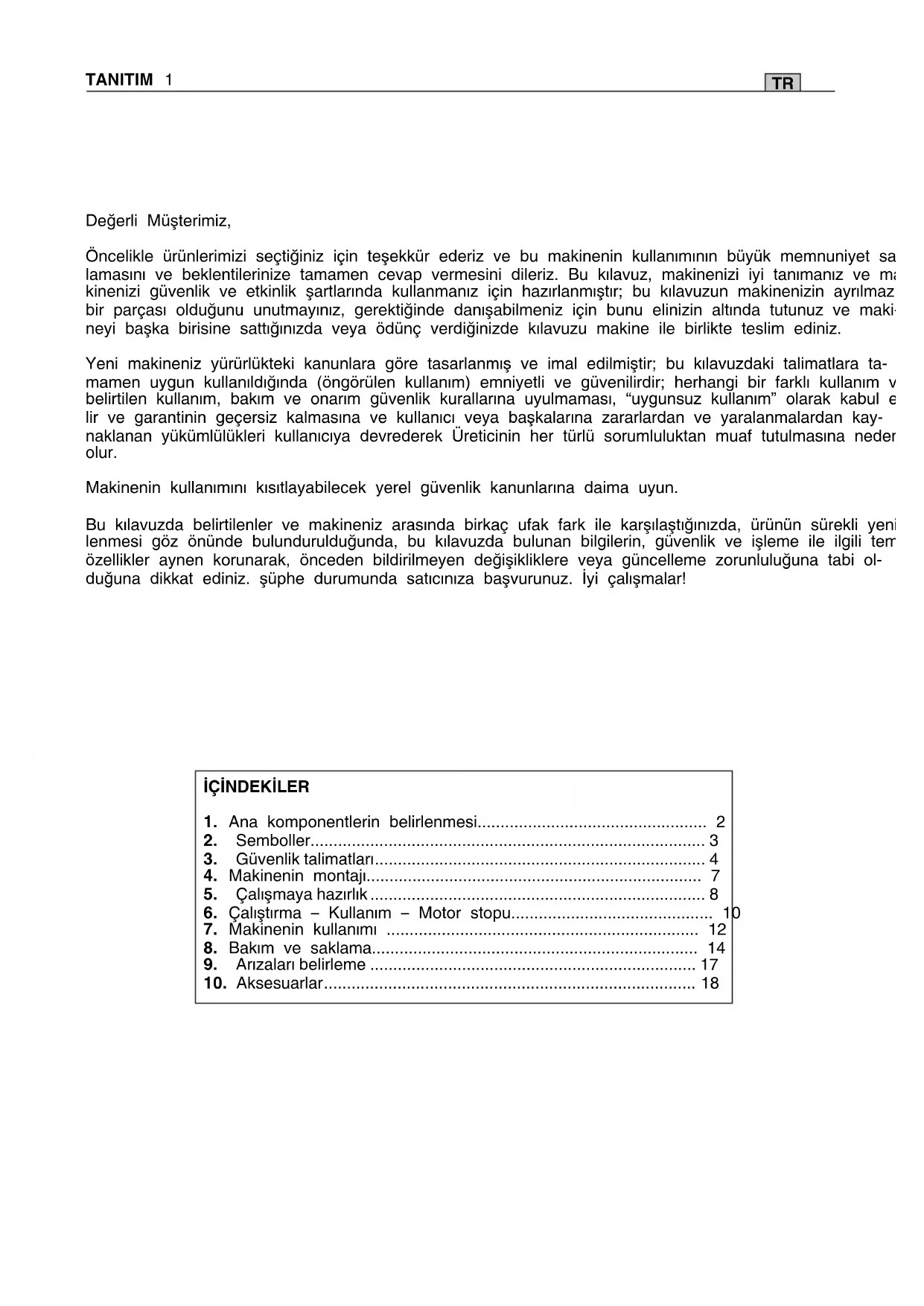 (21BPX078X) Για ανταλλακτικά, χρησιµοποιήστε µόνο αλυσίδες και µπάρες που αναφέρθηκαν πα- ραπάνω. Η χρήση µη εγκεκριµένων συνδυασµών µπορεί να έχει ως αποτέλεσµα τραυµατισµούς και ζηµιές στην µηχανή. ΠΡΟΣΟΧΗ!TR TANITIM 1 Değerli Müşterimiz, Öncelikle ürünlerimizi seçtiğiniz için teşekkür ederiz ve bu makinenin kullanımının büyük memnuniyet sağ- lamasını ve beklentilerinize tamamen cevap vermesini dileriz. Bu kılavuz, makinenizi iyi tanımanız ve ma- kinenizi güvenlik ve etkinlik şartlarında kullanmanız için hazırlanmıştır; bu kılavuzun makinenizin ayrılmaz bir parçası olduğunu unutmayınız, gerektiğinde danışabilmeniz için bunu elinizin altında tutunuz ve maki- neyi başka birisine sattığınızda veya ödünç verdiğinizde kılavuzu makine ile birlikte teslim ediniz. Yeni makineniz yürürlükteki kanunlara göre tasarlanmış ve imal edilmiştir; bu kılavuzdaki talimatlara ta- mamen uygun kullanıldığında (öngörülen kullanım) emniyetli ve güvenilirdir; herhangi bir farklı kullanım veya belirtilen kullanım, bakım ve onarım güvenlik kurallarına uyulmaması, “uygunsuz kullanım” olarak kabul edi- lir ve garantinin geçersiz kalmasına ve kullanıcı veya başkalarına zararlardan ve yaralanmalardan kay- naklanan yükümlülükleri kullanıcıya devrederek Üreticinin her türlü sorumluluktan muaf tutulmasına neden olur. Makinenin kullanımını kısıtlayabilecek yerel güvenlik kanunlarına daima uyun. Bu kılavuzda belirtilenler ve makineniz arasında birkaç ufak fark ile karşılaştığınızda, ürünün sürekli yeni- lenmesi göz önünde bulundurulduğunda, bu kılavuzda bulunan bilgilerin, güvenlik ve işleme ile ilgili temel özellikler aynen korunarak, önceden bildirilmeyen değişikliklere veya güncelleme zorunluluğuna tabi ol- duğuna dikkat ediniz. şüphe durumunda satıcınıza başvurunuz. İyi çalışmalar! İÇİNDEKİLER