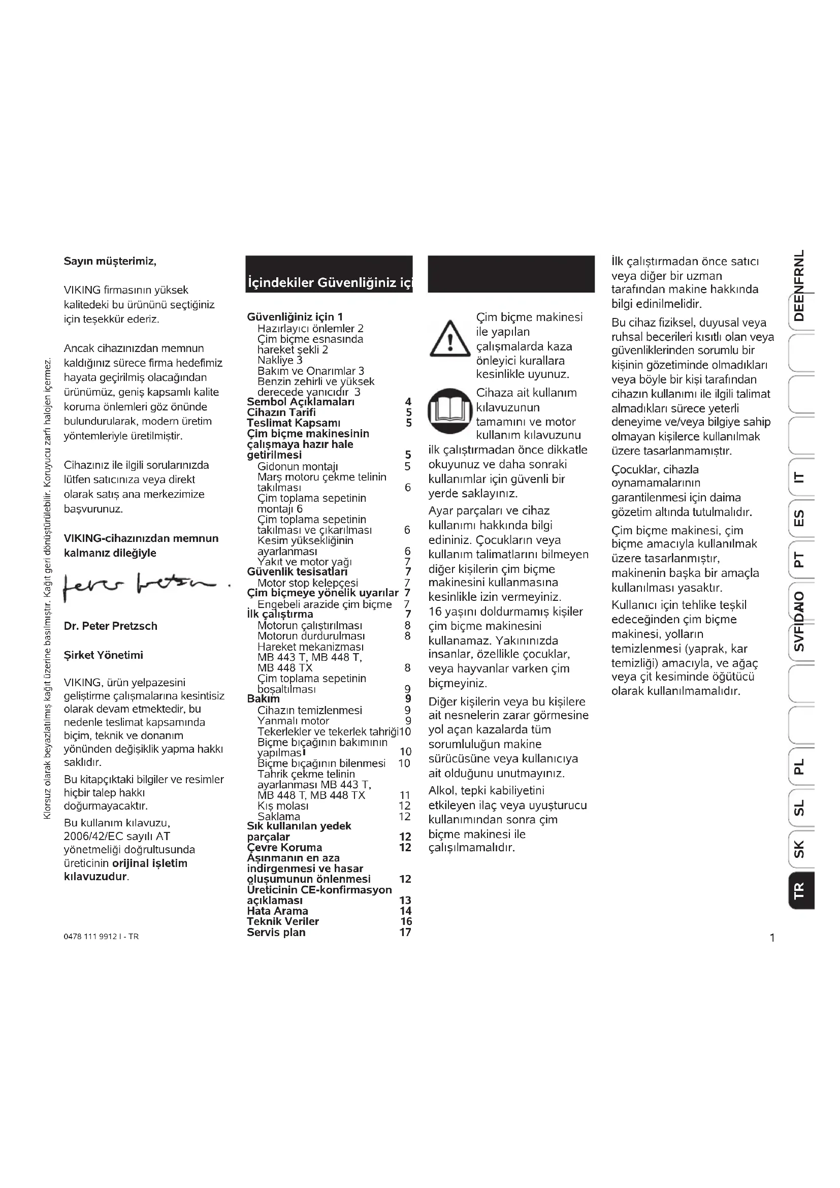 Çim biçme makinesi ile yapılan çalışmalarda kaza önleyici kurallara kesinlikle uyunuz. Cihaza ait kullanım kılavuzunun tamamını ve motor kullanım kılavuzunu ilk çalıştırmadan önce dikkatle okuyunuz ve daha sonraki kullanımlar için güvenli bir yerde saklayınız. Ayar parçaları ve cihaz kullanımı hakkında bilgi edininiz. Çocukların veya kullanım talimatlarını bilmeyen diğer kişilerin çim biçme makinesini kullanmasına kesinlikle izin vermeyiniz. 16 yaşını doldurmamış kişiler çim biçme makinesini kullanamaz. Yakınınızda insanlar, özellikle çocuklar, veya hayvanlar varken çim biçmeyiniz. Diğer kişilerin veya bu kişilere ait nesnelerin zarar görmesine yol açan kazalarda tüm sorumluluğun makine sürücüsüne veya kullanıcıya ait olduğunu unutmayınız. Alkol, tepki kabiliyetini etkileyen ilaç veya uyuşturucu kullanımından sonra çim biçme makinesi ile çalışılmamalıdır. Sayın müşterimiz, VIKING firmasının yüksek kalitedeki bu ürününü seçtiğiniz için teşekkür ederiz. Ancak cihazınızdan memnun kaldığınız sürece firma hedefimiz hayata geçirilmiş olacağından ürünümüz, geniş kapsamlı kalite koruma önlemleri göz önünde bulundurularak, modern üretim yöntemleriyle üretilmiştir. Cihazınız ile ilgili sorularınızda lütfen satıcınıza veya direkt olarak satış ana merkezimize başvurunuz. VIKING-cihazınızdan memnun kalmanız dileğiyle Dr. Peter Pretzsch Şirket Yönetimi VIKING, ürün yelpazesini geliştirme çalışmalarına kesintisiz olarak devam etmektedir, bu nedenle teslimat kapsamında biçim, teknik ve donanım yönünden değişiklik yapma hakkı saklıdır. Bu kitapçıktaki bilgiler ve resimler hiçbir talep hakkı doğurmayacaktır. Bu kullanım kılavuzu, 2006/42/EC sayılı AT yönetmeliği doğrultusunda üreticinin orijinal işletim kılavuzudur. İçindekiler Güvenliğiniz için Güvenliğiniz için 1 Hazırlayıcı önlemler 2 Çim biçme esnasında hareket şekli 2 Nakliye 3 Bakım ve Onarımlar 3 Benzin zehirli ve yüksek derecede yanıcıdır 3 Sembol Açıklamaları 4 Cihazın Tarifi 5 Teslimat Kapsamı 5 Çim biçme makinesinin çalışmaya hazır hale getirilmesi 5 Gidonun montajı 5 Marş motoru çekme telinin takılması 6 Çim toplama sepetinin montajı 6 Çim toplama sepetinin takılması ve çıkarılması 6 Kesim yüksekliğinin ayarlanması 6 Yakıt ve motor yağı 7 Güvenlik tesisatları 7 Motor stop kelepçesi 7 Çim biçmeye yönelik uyarılar 7 Engebeli arazide çim biçme 7 İlk çalıştırma 7 Motorun çalıştırılması 8 Motorun durdurulması 8 Hareket mekanizması MB 443 T, MB 448 T, MB 448 TX 8 Çim toplama sepetinin boşaltılması 9 Bakım 9 Cihazın temizlenmesi 9 Yanmalı motor 9 Tekerlekler ve tekerlek tahriği10 Biçme bıçağının bakımının yapılmas ı 10 Biçme bıçağının bilenmesi 10 Tahrik çekme telinin ayarlanması MB 443 T, MB 448 T, MB 448 TX 11 Kış molası 12 Saklama 12 Sık kullanılan yedek parçalar 12 Çevre Koruma 12 Aşınmanın en aza indirgenmesi ve hasar oluşumunun önlenmesi 12 Üreticinin CE-konfirmasyon açıklaması 13 Hata Arama 14 Teknik Veriler 16 Servis plan 17 İlk çalıştırmadan önce satıcı veya diğer bir uzman tarafından makine hakkında bilgi edinilmelidir. Bu cihaz fiziksel, duyusal veya ruhsal becerileri kısıtlı olan veya güvenliklerinden sorumlu bir kişinin gözetiminde olmadıkları veya böyle bir kişi tarafından cihazın kullanımı ile ilgili talimat almadıkları sürece yeterli deneyime ve/veya bilgiye sahip olmayan kişilerce kullanılmak üzere tasarlanmamıştır. Çocuklar, cihazla oynamamalarının garantilenmesi için daima gözetim altında tutulmalıdır. Çim biçme makinesi, çim biçme amacıyla kullanılmak üzere tasarlanmıştır, makinenin başka bir amaçla kullanılması yasaktır. Kullanıcı için tehlike teşkil edeceğinden çim biçme makinesi, yolların temizlenmesi (yaprak, kar temizliği) amacıyla, ve ağaç veya çit kesiminde öğütücü olarak kullanılmamalıdır. Klorsuz olarak beyazlatılmış kağıt üzerine basılmıştır. Kağıt geri dönüştürülebilir. Koruyucu zarfı halojen içermez.2 0478 111 9912 I - TR