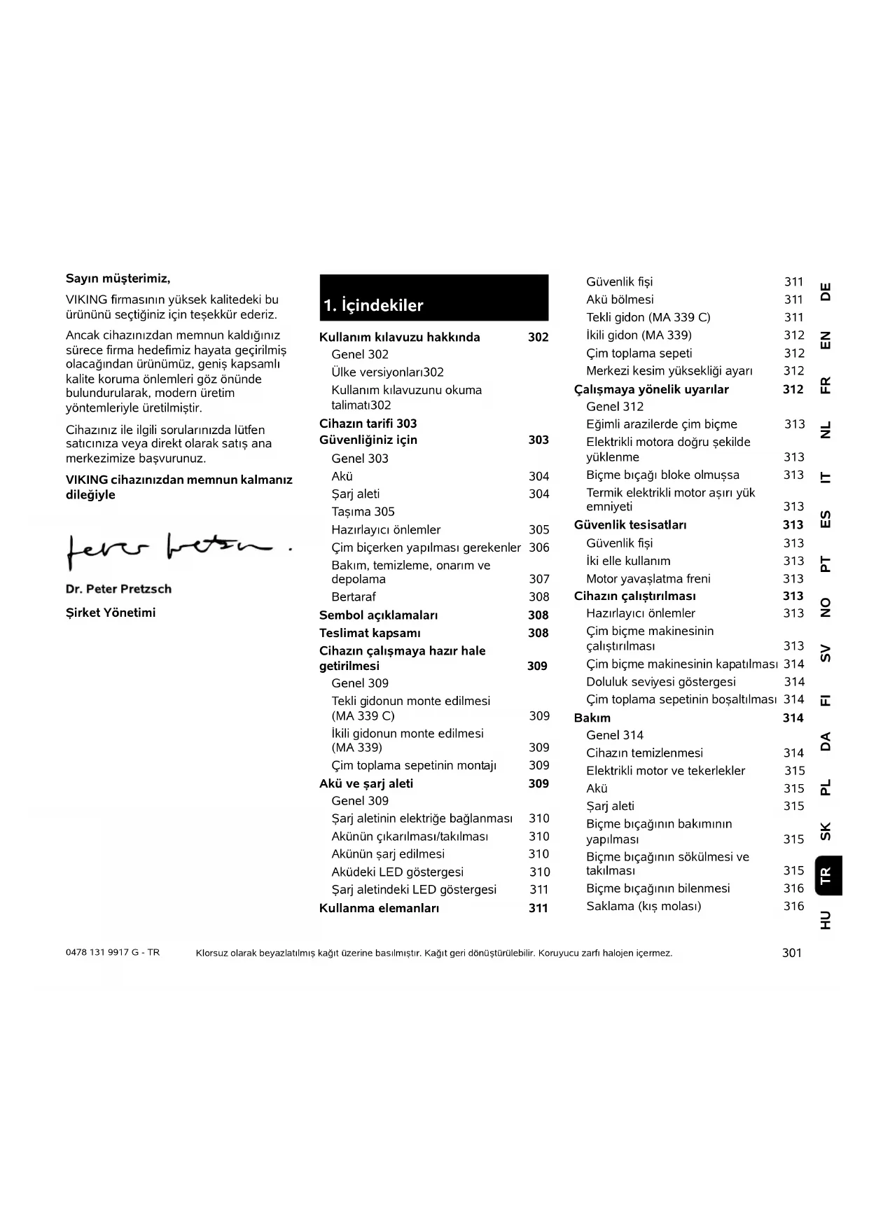 Kullanım kılavuzu hakkında 302 Genel 302 Ülke versiyonları 302 Kullanım kılavuzunu okuma talimatı 302 Cihazın tarifi 303 Güvenliğiniz için 303 Genel 303 Akü 304 Şarj aleti 304 Taşıma 305 Hazırlayıcı önlemler 305 Çim biçerken yapılması gerekenler 306 Bakım, temizleme, onarı m ve depolama 307 Bertaraf 308 Sembol açıklamaları 308 Teslimat kapsamı 308 Cihazın çalışmaya hazır hale getirilmesi 309 Genel 309 Tekli gidonun monte edilmesi (MA 339 C) 309 İkili gidonun monte edilmesi (MA 339) 309 Çim toplama sepetinin montajı 309 Akü ve şarj aleti 309 Genel 309 Şarj aletinin elektriğe bağlanması 310 Akünün çıkarılması/takılması 310 Akünün şarj edilmesi 310 Aküdeki LED göstergesi 310 Şarj aletindeki LED göstergesi 311 Kullanma elemanları 311 Güvenlik fişi311 Akü bölmesi 311 Tekli gidon (MA 339 C) 311 İkili gidon (MA 339) 312 Çim toplama sepeti 312 Merkezi kesim yüksekliği ayarı 312 Çalışmaya yönelik uyarılar 312 Genel 312 Eğimli arazilerde çim biçme 313 Elektrikli motora doğru şekilde yüklenme 313 Biçme bıçağı bloke olmuşsa 313 Termik elektrikli motor aşırı yük emniyeti 313 Güvenlik tesisatları 313 Güvenlik fişi313 İki elle kullanım313 Motor yavaşlatma freni 313 Cihazın çalıştırılması 313 Hazırlayıcı önlemler 313 Çim biçme makinesinin çalıştırılması 313 Çim biçme makinesinin kapatılması 314 Doluluk seviyesi göstergesi 314 Çim toplama sepetinin boşaltılması 314 Bakım314 Genel 314 Cihazın temizlenmesi 314 Elektrikli motor ve tekerlekler 315 Akü 315 Şarj aleti 315 Biçme bıçağının bakımının yapılması 315 Biçme bıçağının sökülmesi ve takılması 315 Biçme bıçağının bilenmesi 316 Saklama (kış molası)3160478 131 9917 G - TR