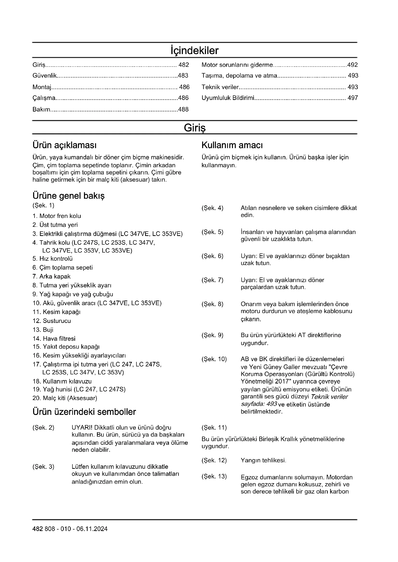 Ürün üzerindeki semboller (Şek. 2) UYARI! Dikkatli olun ve ürünü doğru kullanın. Bu ürün, sürücü ya da başkaları açısından ciddi yaralanmalara veya ölüme neden olabilir. (Şek. 3) Lütfen kullanım kılavuzunu dikkatle okuyun ve kullanımdan önce talimatları anladığınızdan emin olun. (Şek. 4) Atılan nesnelere ve seken cisimlere dikkat edin. (Şek. 5) İnsanları ve hayvanları çalışma alanından güvenli bir uzaklıkta tutun. (Şek. 6) Uyarı: El ve ayaklarınızı döner bıçaktan uzak tutun. (Şek. 7) Uyarı: El ve ayaklarınızı döner parçalardan uzak tutun. (Şek. 8) Onarım veya bakım işlemlerinden önce motoru durdurun ve ateşleme kablosunu çıkarın. (Şek. 9) Bu ürün yürürlükteki AT direktiflerine uygundur. (Şek. 10) AB ve BK direktifleri ile düzenlemeleri ve Yeni Güney Galler mevzuatı "Çevre Koruma Operasyonları (Gürültü Kontrolü) Yönetmeliği 2017" uyarınca çevreye yayılan gürültü emisyonu etiketi. Ürünün garantili ses gücü düzeyi Teknik veriler sayfada: 493 ve etiketin üstünde belirtilmektedir. (Şek. 11) Bu ürün yürürlükteki Birleşik Krallık yönetmeliklerine uygundur. (Şek. 12) Yangın tehlikesi. (Şek. 13) Egzoz dumanlarını solumayın. Motordan gelen egzoz dumanı kokusuz, zehirli ve son derece tehlikeli bir gaz olan karbon 482 808 - 010 - 06.11.2024monoksit içerir. Motoru iç mekanlarda veya kapalı alanlarda çalıştırmayın. (Şek. 14) Sıcak yüzey. (Şek. 16) Ürünü çalıştırmadan önce mo- tora yağ doldurun. (Şek. 17) LC247, LC247S, LC253S, LC347V, LC353V için çalış- tırma prosedürü: Motor fren kolunu aşağı bastırın ve çalış- tırma ipi kolunu çekin. (Şek. 18) LC347VE, LC353VE için ça- lıştırma prosedürü: Motor fren kolunu aşağı bastırın ve çalış- tırma düğmesine basın. (Şek. 15) Taranabilir kod. Not: Ürünün üzerindeki diğer semboller/etiketler, diğer ticari alanların sertifikalandırma gereklilikleri ile ilgilidir. Avrupa V Emisyonları UYARI: Motorun kurcalanması bu ürünün AB tip onayını geçersiz kılar. Üründe oluşabilecek hasarlar Aşağıdaki durumlarda ürünümüzde oluşabilecek hasarlardan sorumlu olmayız: