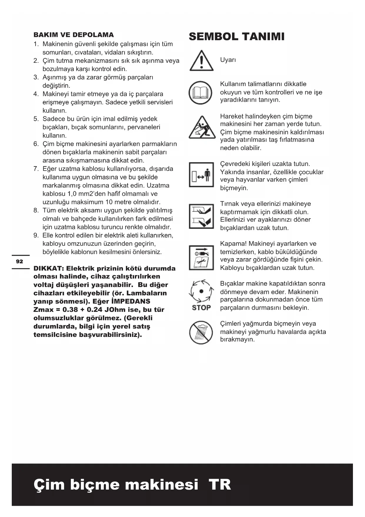 Uyarı Kullanım talimatlarını dikkatle okuyun ve tüm kontrolleri ve ne işe yaradıklarını tanıyın. Hareket halindeyken çim biçme makinesini her zaman yerde tutun. Çim biçme makinesinin kaldırılması yada yatırılması taş fırlatmasına neden olabilir. Çevredeki kişileri uzakta tutun. Yakında insanlar, özellikle çocuklar veya hayvanlar varken çimleri biçmeyin. Tırnak veya ellerinizi makineye kaptırmamak için dikkatli olun. Ellerinizi ver ayaklarınızı döner bıçaklardan uzak tutun. Kapama! Makineyi ayarlarken ve temizlerken, kablo büküldüğünde veya zarar gördüğünde şini çekin. Kabloyu bıçaklardan uzak tutun. Bıçaklar makine kapatıldıktan sonra dönmeye devam eder. Makinenin parçalarına dokunmadan önce tüm parçaların durmasını bekleyin. Çimleri yağmurda biçmeyin veya makineyi yağmurlu havalarda açıkta bırakmayın.Çim biçme makinesi TR
