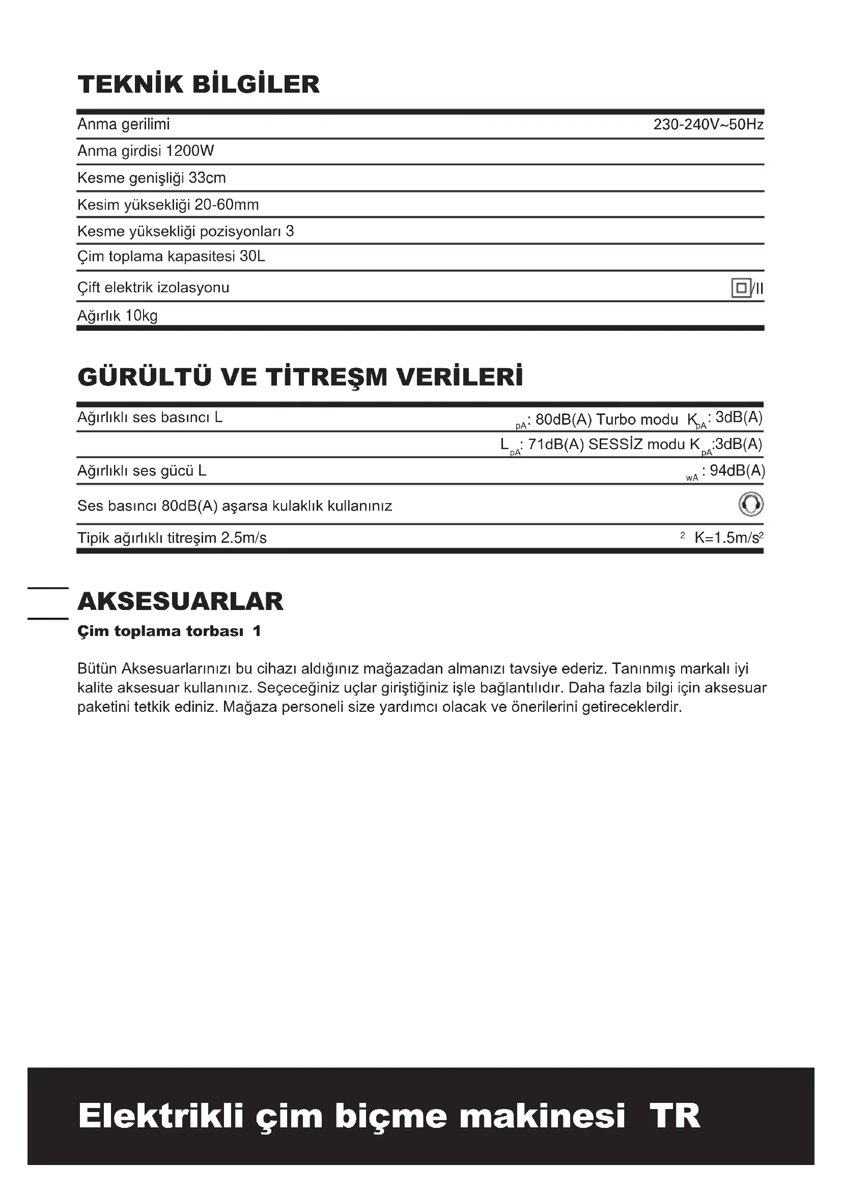Anma gerilimi 230-240V~50Hz Anma girdisi 1200W Kesme genişliği 33cm Kesim yüksekliği 20-60mm Kesme yüksekliği pozisyonları 3 Çim toplama kapasitesi 30L Çift elektrik izolasyonu /II Ağırlık 10kg