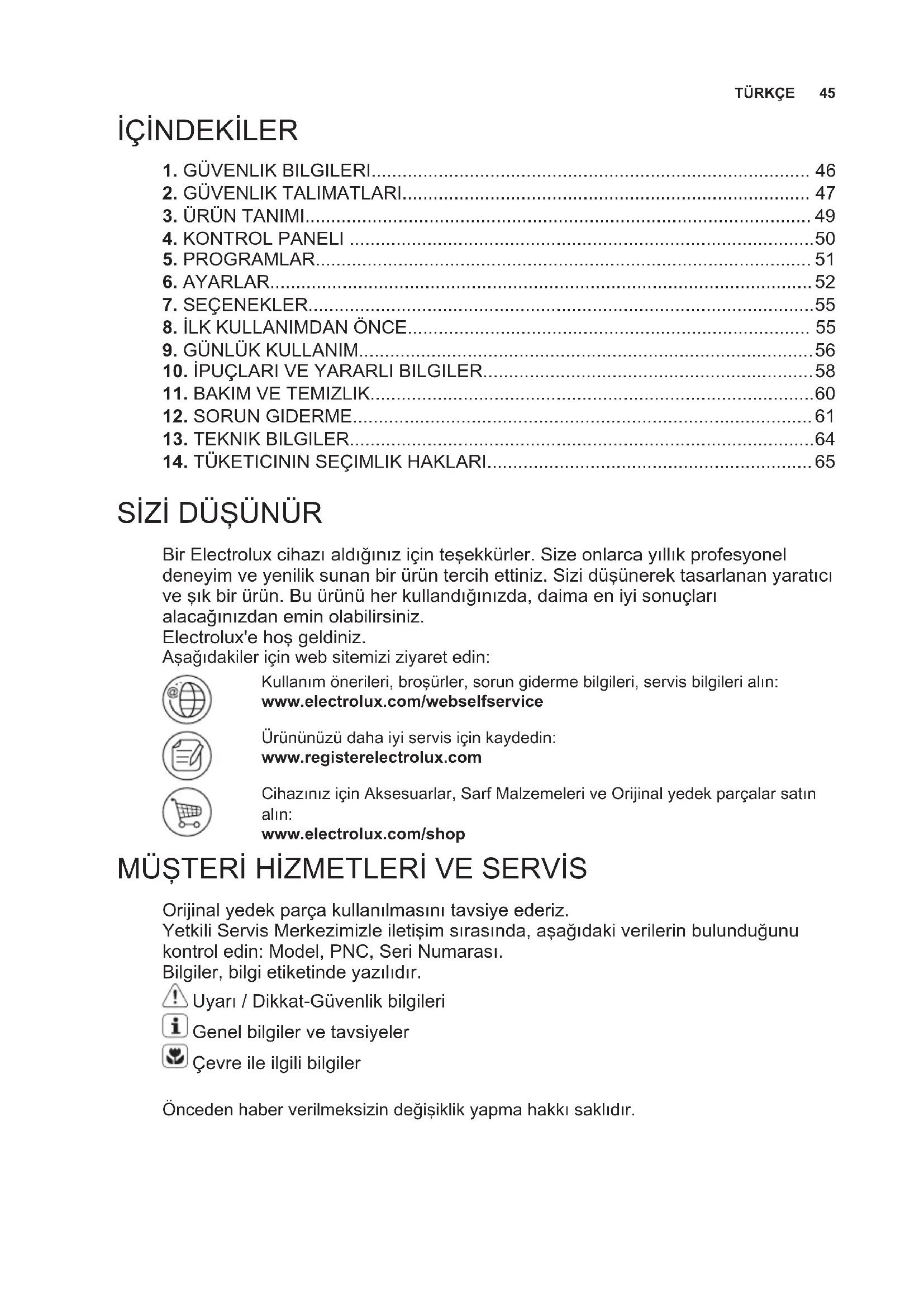 Bir Electrolux cihazı aldığınız için teşekkürler. Size onlarca yıllık profesyonel deneyim ve yenilik sunan bir ürün tercih ettiniz. Sizi düşünerek tasarlanan yaratıcı ve şık bir ürün. Bu ürünü her kullandığınızda, daima en iyi sonuçları alacağınızdan emin olabilirsiniz. Electrolux'e hoş geldiniz. Aşağıdakiler için web sitemizi ziyaret edin: Kullanım önerileri, broşürler, sorun giderme bilgileri, servis bilgileri alın: www.electrolux.com/webselfservice Ürününüzü daha iyi servis için kaydedin: www.registerelectrolux.com Cihazınız için Aksesuarlar, Sarf Malzemeleri ve Orijinal yedek parçalar satın alın: www.electrolux.com/shop MÜŞTERİ HİZMETLERİ VE SERVİS Orijinal yedek parça kullanılmasını tavsiye ederiz. Yetkili Servis Merkezimizle iletişim sırasında, aşağıdaki verilerin bulunduğunu kontrol edin: Model, PNC, Seri Numarası. Bilgiler, bilgi etiketinde yazılıdır. Uyarı / Dikkat-Güvenlik bilgileri Genel bilgiler ve tavsiyeler Çevre ile ilgili bilgiler Önceden haber verilmeksizin değişiklik yapma hakkı saklıdır.