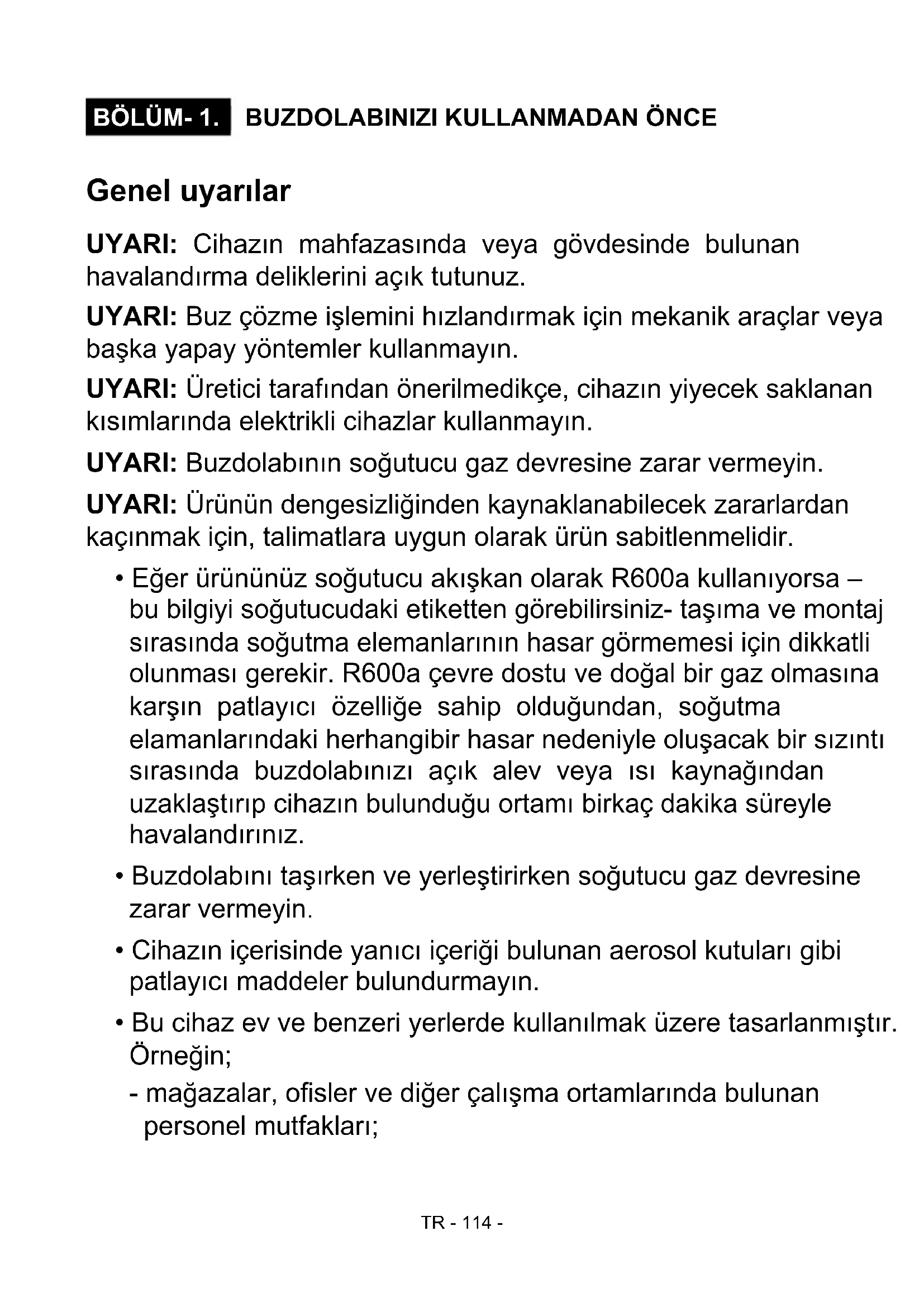 BÖLÜM- 1. Genel uyarılar UYARI: Cihazın mahfazasında veya gövdesinde bulunan havalandırma deliklerini açık tutunuz. UYARI: Buz çözme işlemini hızlandırmak için mekanik araçlar veya başka yapay yöntemler kullanmayın. UYARI: Üretici tarafından önerilmedikçe, cihazın yiyecek saklanan kısımlarında elektrikli cihazlar kullanmayın. UYARI: Buzdolabının soğutucu gaz devresine zarar vermeyin. UYARI: Ürünün dengesizliğinden kaynaklanabilecek zararlardan kaçınmak için, talimatlara uygun olarak ürün sabitlenmelidir.