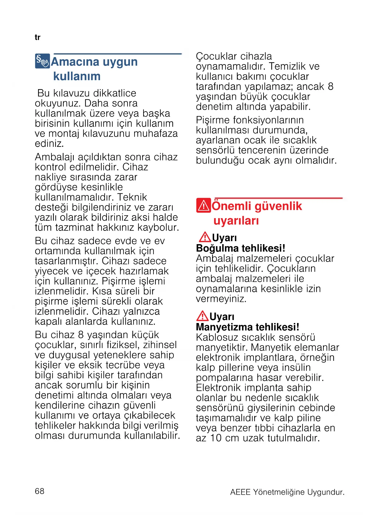 8 Amacına uygun kullanım Amacı na uygun kul l anı m Bu kılavuzu dikkatlice okuyunuz. Daha sonra kullanılmak üzere veya başka birisinin kullanımı için kullanım ve montaj kılavuzunu muhafaza ediniz. Ambalajı açıldıktan sonra cihaz kontrol edilmelidir. Cihaz nakliye sırasında zarar gördüyse kesinlikle kullanılmamalıdır. Teknik desteği bilgilendiriniz ve zararı yazılı olarak bildiriniz aksi halde tüm tazminat hakkınız kaybolur. Bu cihaz sadece evde ve ev ortamında kullanılmak için tasarlanmıştır. Cihazı sadece yiyecek ve içecek hazırlamak için kullanınız. Pişirme işlemi izlenmelidir. Kısa süreli bir pişirme işlemi sürekli olarak izlenmelidir. Cihazı yalnızca kapalı alanlarda kullanınız. Bu cihaz 8 yaşından küçük çocuklar, sınırlı fiziksel, zihinsel ve duygusal yeteneklere sahip kişiler ve eksik tecrübe veya bilgi sahibi kişiler tarafından ancak sorumlu bir kişinin denetimi altında olmaları veya kendilerine cihazın güvenli kullanımı ve ortaya çıkabilecek tehlikeler hakkında bilgi verilmiş olması durumunda kullanılabilir. Çocuklar cihazla oynamamalıdır. Temizlik ve kullanıcı bakımı çocuklar tarafından yapılamaz; ancak 8 yaşından büyük çocuklar denetim altında yapabilir. Pişirme fonksiyonlarının kullanılması durumunda, ayarlanan ocak ile sıcaklık sensörlü tencerenin üzerinde bulunduğu ocak aynı olmalıdır. ( Önemli güvenlik uyarıları Önemli güvenl i k uy ar ı ları :Uyarı Boğulma tehlikesi! Ambalaj malzemeleri çocuklar için tehlikelidir. Çocukların ambalaj malzemeleri ile oynamalarına kesinlikle izin vermeyiniz. :Uyarı Manyetizma tehlikesi! Kablosuz sıcaklık sensörü manyetiktir. Manyetik elemanlar elektronik implantlara, örneğin kalp pillerine veya insülin pompalarına hasar verebilir. Elektronik implanta sahip olanlar bu nedenle sıcaklık sensörünü giysilerinin cebinde taşımamalıdır ve kalp piline veya benzer tıbbi cihazlarla en az 10 cm uzak tutulmalıdır.AEEE Yönetmeliǧine Uygundur.