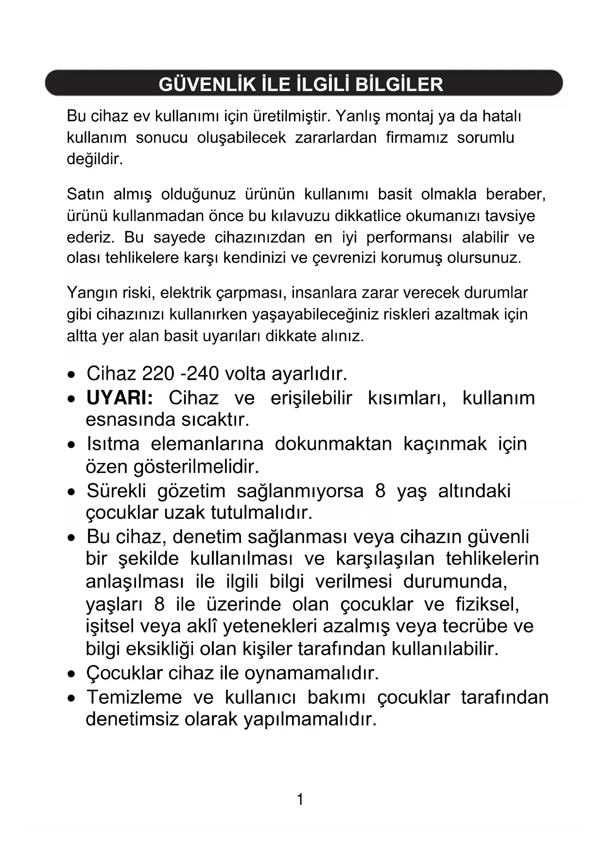 Ürün kullanımdayken ve kullanım sonrasında soğuyana kadar ürünün açıktaki kısımları ısınacaktır; çocuklar uzak tutulmalıdır. Ürünün üzerine çocukların ulaşabilecekleri nesneleri koymayın. Ambalaj malzemeleri çocuklar için tehlikeli olabilir. Ambalaj malzemelerini, çocukların ulaşamayacakları bir yerde muhafaza edin veya atık talimatlarına uygun bir şekilde tasnif ederek çöpe atın.