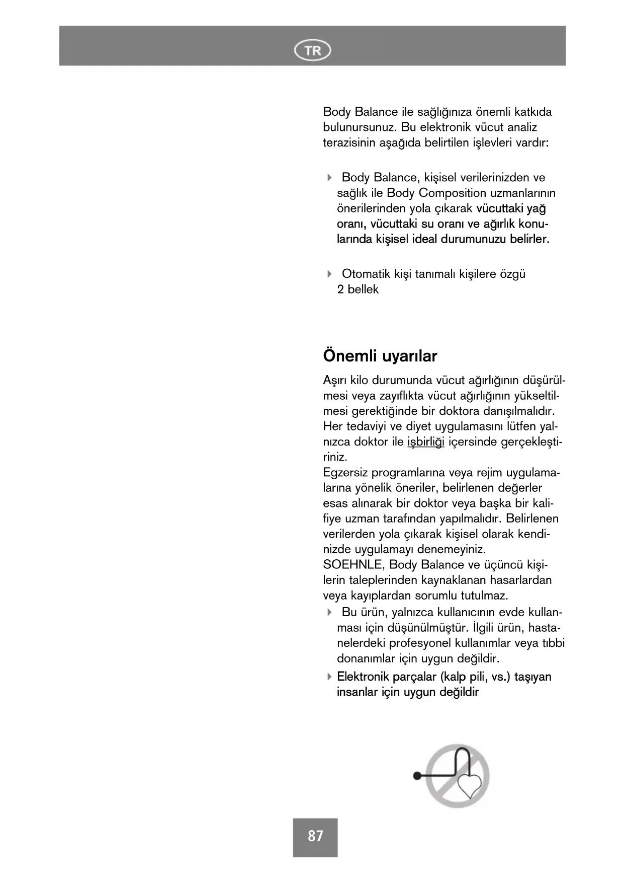 470-065-281.qxd 21.04.2005 10:51 Uhr Seite 8687 Body Balance ile saπlıπınıza önemli katkıda bulunursunuz. Bu elektronik vücut analiz terazisinin aµaπıda belirtilen iµlevleri vardır: Body Balance, kiµisel verilerinizden ve saπlık ile Body Composition uzmanlarının önerilerinden yola çıkarak vvüüccuuttttaakkii yyaaππ oorraannıı,, vvüüccuuttttaakkii ssuu oorraannıı vvee aaππıırrllııkk kkoonnuu-- llaarrıınnddaa kkiiµµiisseell iiddeeaall dduurruummuunnuuzzuu bbeelliirrlleerr.. Otomatik kiµi tanımalı kiµilere özgü 2 bellek Önemli uyarılar Aµırı kilo durumunda vücut aπırlıπının düµürül- mesi veya zayıflıkta vücut aπırlıπının yükseltil- mesi gerektiπinde bir doktora danıµılmalıdır. Her tedaviyi ve diyet uygulamasını lütfen yal- nızca doktor ile iµbirliπi içersinde gerçekleµti- riniz. Egzersiz programlarına veya rejim uygulama- larına yönelik öneriler, belirlenen deπerler esas alınarak bir doktor veya baµka bir kali- fiye uzman tarafından yapılmalıdır. Belirlenen verilerden yola çıkarak kiµisel olarak kendi- nizde uygulamayı denemeyiniz. SOEHNLE, Body Balance ve üçüncü kiµi- lerin taleplerinden kaynaklanan hasarlardan veya kayıplardan sorumlu tutulmaz. Bu ürün, yalnızca kullanıcının evde kullan- ması için düµünülmüµtür. ∑lgili ürün, hasta- nelerdeki profesyonel kullanımlar veya tıbbi donanımlar için uygun deπildir.
