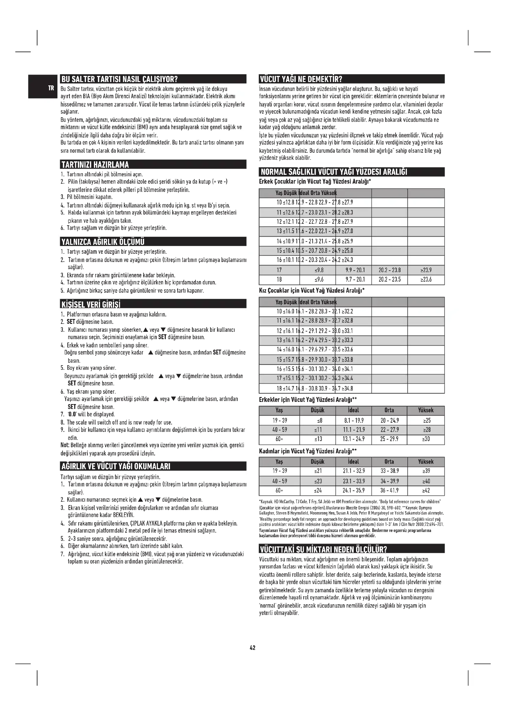 60+ ≤24 24.1 - 35.9 36 - 41.9 ≥42 *Kaynak: HD McCarthy, TJ Cole, T Fry, SA Jebb ve AM Prentice’den alınmıştır. “Body fat reference curves for children” (Çocuklar için vücut yağı referans eğrileri).Uluslararası Obezite Dergisi (2006) 30, 598–602. **Kaynak: Dympna Gallagher, Steven B Heymsfield, Moonseong Heo, Susan A Jebb, Peter R Murgatroyd ve Yoichi Sakamoto’dan alınmıştır. “Healthy percentage body fat ranges: an approach for developing guidelines based on body mass (Sağlıklı vücut yağ yüzdesi aralıkları: vücut kitle indeksine dayalı kılavuz belirleme yaklaşımı) dizin 1-3” Am J Clin Nutr 2000;72:694–701. Yayımlanan Vücut Yağ Yüzdesi aralıkları yalnızca rehberlik amaçlıdır. Beslenme ve egzersiz programlarına başlamadan önce profesyonel tıbbi danışma hizmeti alınması gereklidir. VÜCUTTAKİ SU MİKTARI NEDEN ÖLÇÜLÜR? Vücuttaki su miktarı, vücut ağırlığının en önemli bileşenidir. Toplam ağırlığınızın yarısından fazlası ve vücut kitlenizin (ağırlıklı olarak kas) yaklaşık üçte ikisidir. Su vücutta önemli rollere sahiptir. İster deride, salgı bezlerinde, kaslarda, beyinde isterse de başka bir yerde olsun vücuttaki tüm hücreler yeterli su olduğunda işlevlerini yerine getirebilmektedir. Su aynı zamanda özellikle terleme yoluyla vücudun ısı dengesini düzenlemede hayati rol oynamaktadır. Ağırlık ve yağ ölçümünüzün kombinasyonu ‘normal’ görünebilir, ancak vücudunuzun nemlilik düzeyi sağlıklı bir yaşam için yeterli olmayabilir.43