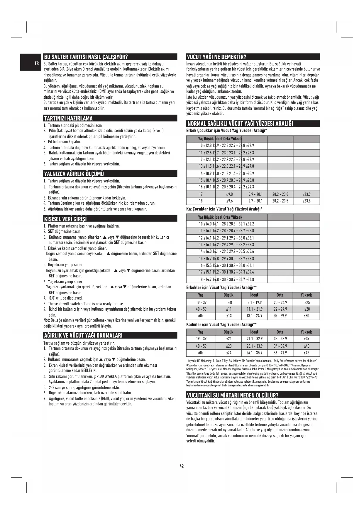 60+ ≤24 24.1 - 35.9 36 - 41.9 ≥42 *Kaynak: HD McCarthy, TJ Cole, T Fry, SA Jebb ve AM Prentice’den alınmıştır. “Body fat reference curves for children” (Çocuklar için vücut yağı referans eğrileri).Uluslararası Obezite Dergisi (2006) 30, 598–602. **Kaynak: Dympna Gallagher, Steven B Heymsfield, Moonseong Heo, Susan A Jebb, Peter R Murgatroyd ve Yoichi Sakamoto’dan alınmıştır. “Healthy percentage body fat ranges: an approach for developing guidelines based on body mass (Sağlıklı vücut yağ yüzdesi aralıkları: vücut kitle indeksine dayalı kılavuz belirleme yaklaşımı) dizin 1-3” Am J Clin Nutr 2000;72:694–701. Yayımlanan Vücut Yağ Yüzdesi aralıkları yalnızca rehberlik amaçlıdır. Beslenme ve egzersiz programlarına başlamadan önce profesyonel tıbbi danışma hizmeti alınması gereklidir. VÜCUTTAKİ SU MİKTARI NEDEN ÖLÇÜLÜR? Vücuttaki su miktarı, vücut ağırlığının en önemli bileşenidir. Toplam ağırlığınızın yarısından fazlası ve vücut kitlenizin (ağırlıklı olarak kas) yaklaşık üçte ikisidir. Su vücutta önemli rollere sahiptir. İster deride, salgı bezlerinde, kaslarda, beyinde isterse de başka bir yerde olsun vücuttaki tüm hücreler yeterli su olduğunda işlevlerini yerine getirebilmektedir. Su aynı zamanda özellikle terleme yoluyla vücudun ısı dengesini düzenlemede hayati rol oynamaktadır. Ağırlık ve yağ ölçümünüzün kombinasyonu ‘normal’ görünebilir, ancak vücudunuzun nemlilik düzeyi sağlıklı bir yaşam için yeterli olmayabilir.43