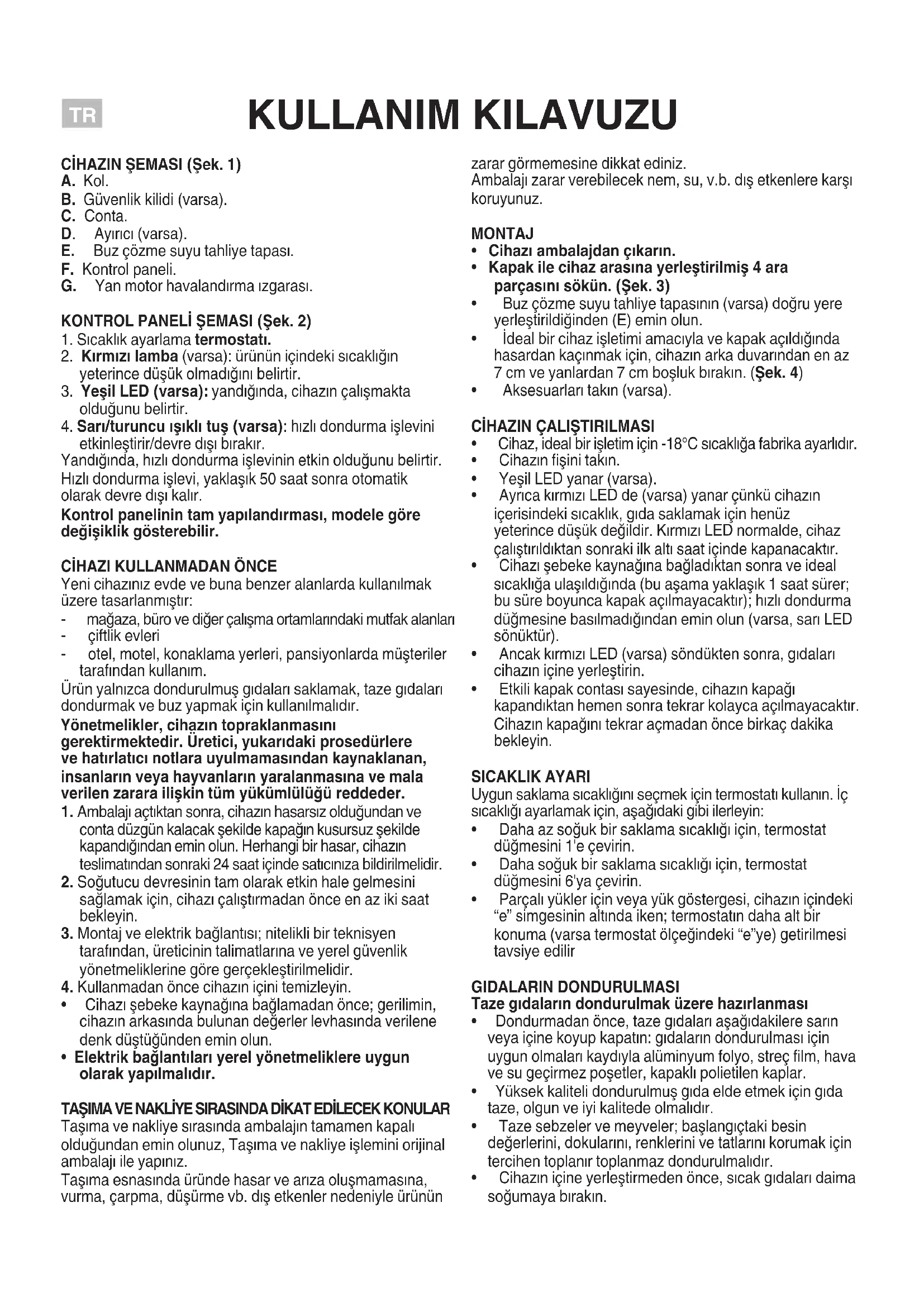 Ambalajıaçtıktansonra,cihazınhasarsızolduğundanve contadüzgünkalacakşekildekapağınkusursuzşekilde kapandığındaneminolun.Herhangibirhasar,cihazın teslimatındansonraki24saatiçindesatıcınızabildirilmelidir. Soğutucudevresinintamolaraketkinhalegelmesini sağlamakiçin,cihazıçalıştırmadanönceenazikisaat bekleyin. Montajveelektrikbağlantısı;niteliklibirteknisyen tarafından,üreticinintalimatlarınaveyerelgüvenlik yönetmeliklerinegöregerçekleştirilmelidir. Kullanmadanöncecihazıniçinitemizleyin.