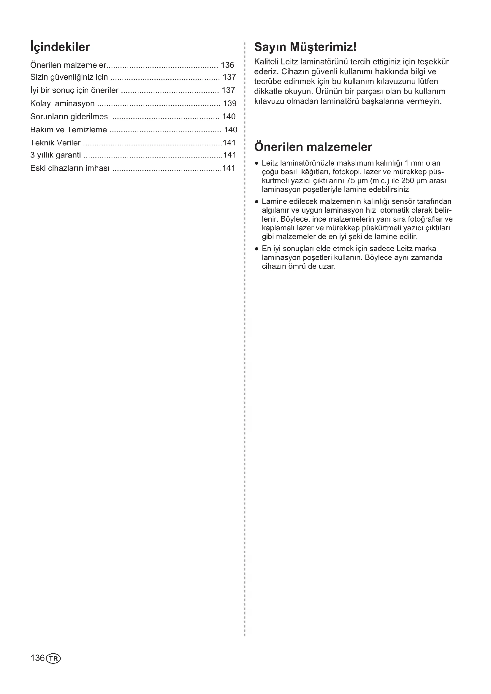 Sayın Müşterimiz! Kaliteli Leitz laminatörünü tercih ettiğiniz için teşekkür ederiz. Cihazın güvenli kullanımı hakkında bilgi ve tecrübe edinmek için bu kullanım kılavuzunu lütfen dikkatle okuyun. Ürünün bir parçası olan bu kullanım kılavuzu olmadan laminatörü başkalarına vermeyin. Önerilen malzemeler