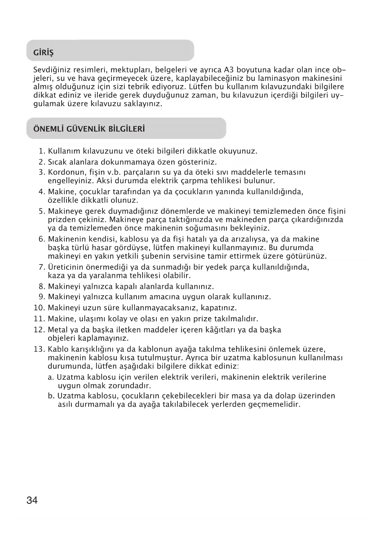 - Laminasyon makinesi, laminasyon folyosunu kaplanılacak olan maddeye sonradan çıkarılamaz bir biçimde yapıştırır. Bu durumu lütfen göz önünde bulundurunuz.