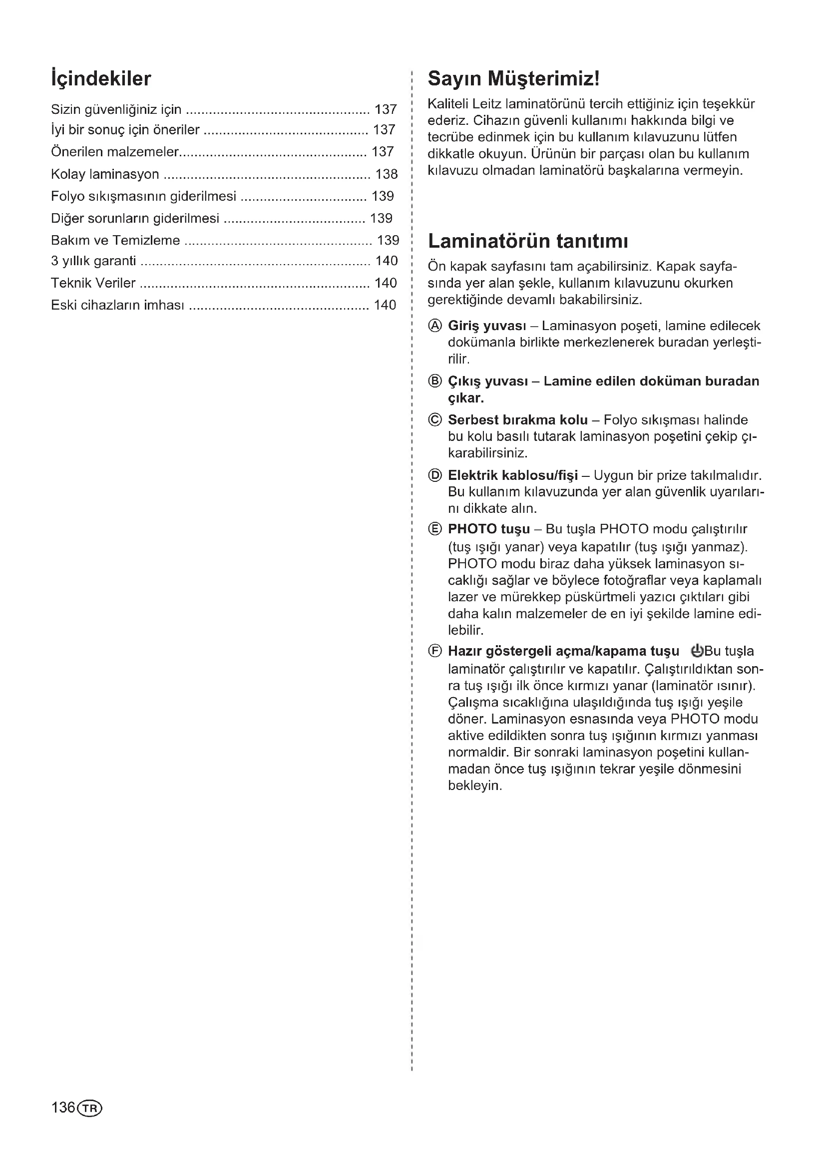 - Eski cihazların imhası Sayın Müşterimiz! Kaliteli Leitz laminatörünü tercih ettiğiniz için teşekkür ederiz. Cihazın güvenli kullanımı hakkında bilgi ve tecrübe edinmek için bu kullanım kılavuzunu lütfen dikkatle okuyun. Ürünün bir parçası olan bu kullanım kılavuzu olmadan laminatörü başkalarına vermeyin. p. 140
