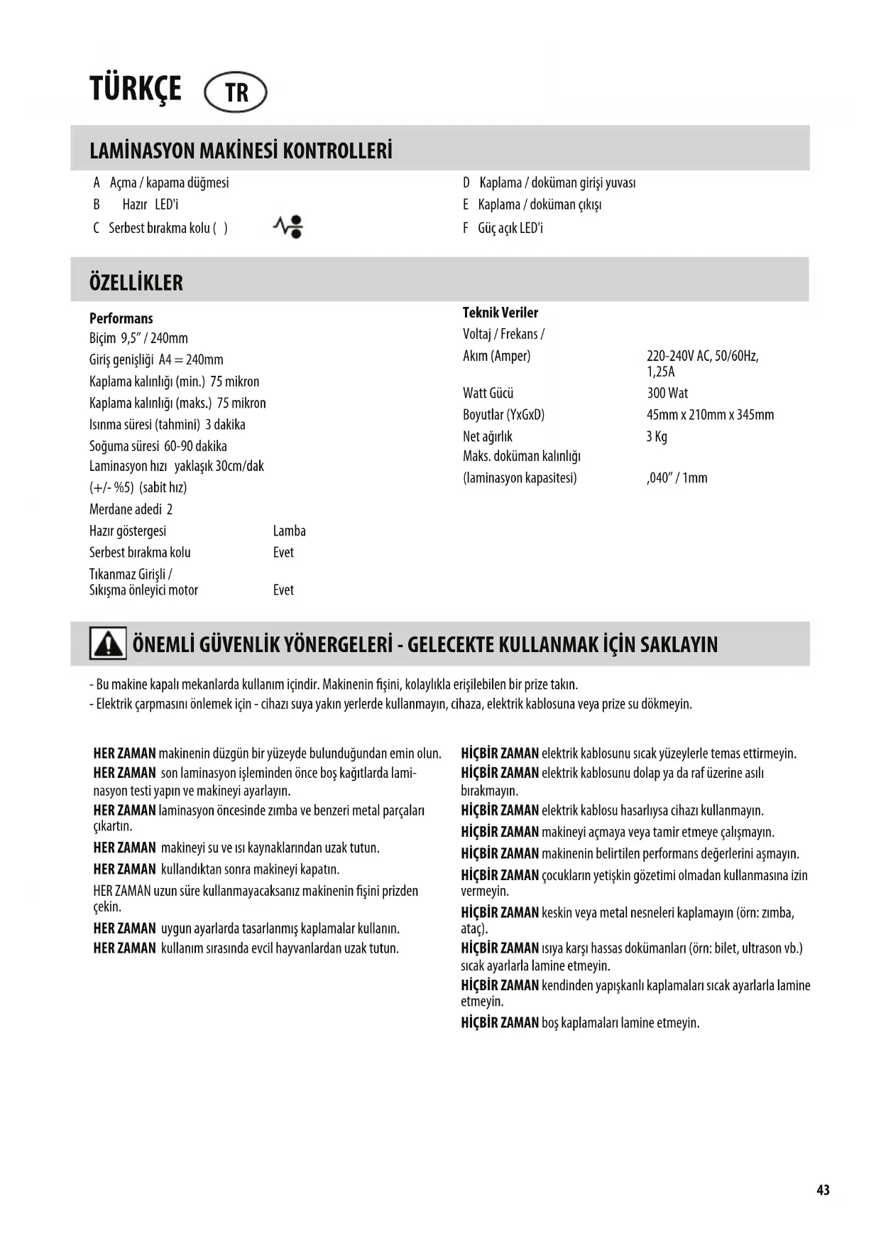A Açma / kapama düğmesi B Hazır LED'i C Serbest bırakma kolu ( ) D Kaplama / doküman girişi yuvası E Kaplama / doküman çıkışı F Güç açık LED'i ÖZELLİKLER Performans Biçim 9,5” / 240mm Giriş genişliği A4 = 240mm Kaplama kalınlığı (min.) 75 mikron Kaplama kalınlığı (maks.) 75 mikron Isınma süresi (tahmini) 3 dakika Soğuma süresi 60-90 dakika Laminasyon hızı yaklaşık 30cm/dak (+/- %5) (sabit hız) Merdane adedi 2 Hazır göstergesi Lamba Serbest bırakma kolu Evet Tıkanmaz Girişli / Sıkışma önleyici motor Evet Teknik Veriler Voltaj / Frekans / Akım (Amper) 220-240V AC, 50/60Hz, 1,25A Watt Gücü 300 Wat Boyutlar (YxGxD) 45mm x 210mm x 345mm Net ağırlık 3 Kg Maks. doküman kalınlığı (laminasyon kapasitesi) ,040” / 1mm - Bu makine kapalı mekanlarda kullanım içindir. Makinenin şini, kolaylıkla erişilebilen bir prize takın. - Elektrik çarpmasını önlemek için - cihazı suya yakın yerlerde kullanmayın, cihaza, elektrik kablosuna veya prize su dökmeyin. HER ZAMAN makinenin düzgün bir yüzeyde bulunduğundan emin olun. HER ZAMAN son laminasyon işleminden önce boş kağıtlarda lami- nasyon testi yapın ve makineyi ayarlayın. HER ZAMAN laminasyon öncesinde zımba ve benzeri metal parçaları çıkartın. HER ZAMAN makineyi su ve ısı kaynaklarından uzak tutun. HER ZAMAN kullandıktan sonra makineyi kapatın. HER ZAMAN uzun süre kullanmayacaksanız makinenin şini prizden çekin. HER ZAMAN uygun ayarlarda tasarlanmış kaplamalar kullanın. HER ZAMAN kullanım sırasında evcil hayvanlardan uzak tutun. HİÇBİR ZAMAN elektrik kablosunu sıcak yüzeylerle temas ettirmeyin. HİÇBİR ZAMAN elektrik kablosunu dolap ya da raf üzerine asılı bırakmayın. HİÇBİR ZAMAN elektrik kablosu hasarlıysa cihazı kullanmayın. HİÇBİR ZAMAN makineyi açmaya veya tamir etmeye çalışmayın. HİÇBİR ZAMAN makinenin belirtilen performans değerlerini aşmayın. HİÇBİR ZAMAN çocukların yetişkin gözetimi olmadan kullanmasına izin vermeyin. HİÇBİR ZAMAN keskin veya metal nesneleri kaplamayın (örn: zımba, ataç). HİÇBİR ZAMAN ısıya karşı hassas dokümanları (örn: bilet, ultrason vb.) sıcak ayarlarla lamine etmeyin. HİÇBİR ZAMAN kendinden yapışkanlı kaplamaları sıcak ayarlarla lamine etmeyin. HİÇBİR ZAMAN boş kaplamaları lamine etmeyin.ÖZELLİKLER & İPUÇLARI ‘Serbest Bırakma’ işlevi Laminasyon sırasında bir kaplamayı çıkartmak ya da yeniden hizalamak için makinenin arkasına yerleştirilen serbest bırakma kolunu etkinleştirin. Kaplama yalnızca kol etkinleştirildiğinde giriş yuvasından çıkarılabilir. Otomatik Kapatma 30 dakika sonra makine otomatik olarak Otomatik Kapanma moduna geçecektir. Güç LED’i 5 dakika boyunca kırmızı yanıp sönecek ve ardından kapanacaktır. Hazır LED’i kapanacaktır. Makineyi kullanmaya devam etmek için, AÇIK/KAPALI düğmesine basın. Makine kendisini sıfırlayacaktır. t En iyi sonuçları elde etmek için, Fellowes ® marka kaplamalar kullanın: Enhance 75. t Bu makine, laminasyon için bir taşıyıcıya ihtiyaç duymaz. Taşıyıcısız mekanizmaya sahiptir. t Kaplanacak öğeyi her zaman uygun boyutta bir kaplama içine yerleştirin. t Son işlemden önce her zaman benzer boyut ve kalınlıkta test lami- nasyonu yapın. t Laminasyon kaplamasını ve öğeyi hazırlayın. Öğeyi, kaplamayı orta- layarak ve ön kapalı kenara dokunacak şekilde yerleştirin. Kaplamanın öğe için çok geniş olmadığından emin olun. t Gerekirse, laminasyon ve soğuma işleminden önce öğenin çevresindeki malzeme fazlalığını kırpın.