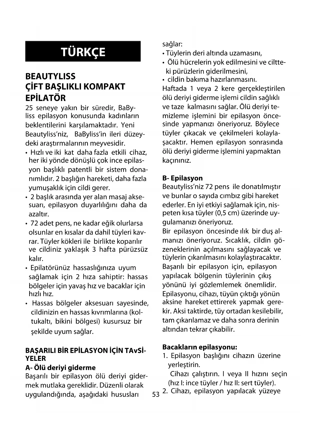 - cildin bakıma hazırlanmasını. Haftada 1 veya 2 kere gerçekleştirilen ölü deriyi giderme işlemi cildin sağlıklı ve taze kalmasını sağlar. Ölü deriyi te- mizleme işlemini bir epilasyon önce- sinde yapmanızı öneriyoruz. Böylece tüyler çıkacak ve çekilmeleri kolayla- şacaktır. Hemen epilasyon sonrasında ölü deriyi giderme işlemini yapmaktan kaçınınız. B- Epilasyon Beautyliss’niz 72 pens ile donatılmıştır ve bunlar o sayıda cımbız gibi hareket ederler. En iyi etkiyi sağlamak için, nis- peten kısa tüyler (0,5 cm) üzerinde uy- gulamanızı öneriyoruz. Bir epilasyon öncesinde ılık bir duş al- manızı öneriyoruz. Sıcaklık, cildin gö- zeneklerinin açılmasını sağlayacak ve tüylerin çıkarılmasını kolaylaştıracaktır. Başarılı bir epilasyon için, epilasyon yapılacak bölgenin tüylerinin çıkış yönünü iyi gözlemlemek önemlidir. Epilasyonu, cihazı, tüyün çıktığı yönün aksine hareket ettirerek yapmak gere- kir. Aksi taktirde, tüy ortadan kesilebilir, tam çıkarılamaz ve daha sonra derinin altından tekrar çıkabilir. Bacakların epilasyonu: