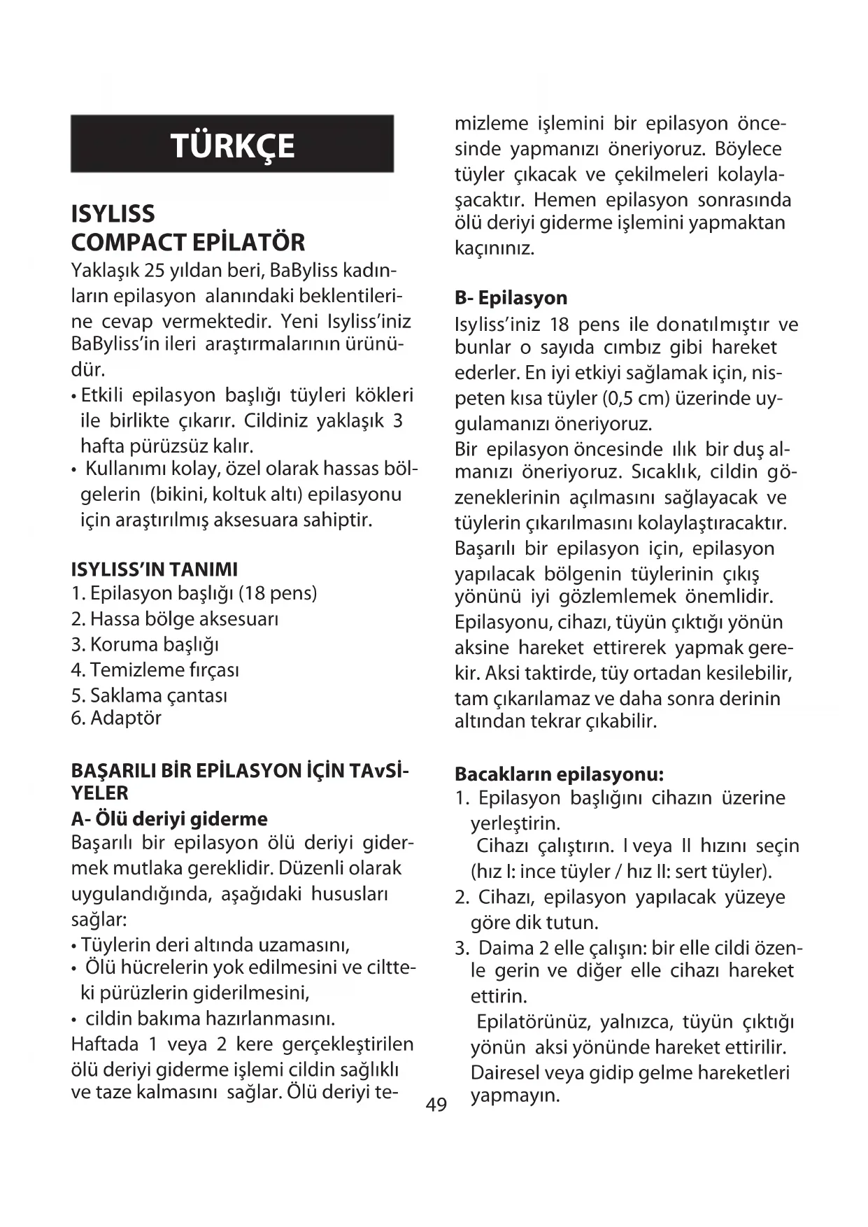 - Babyliss Isyliss’i bu kullanım kılavu- zunda belirtilenlere uyarak ve yalnızca epilasyon için kullanınız.