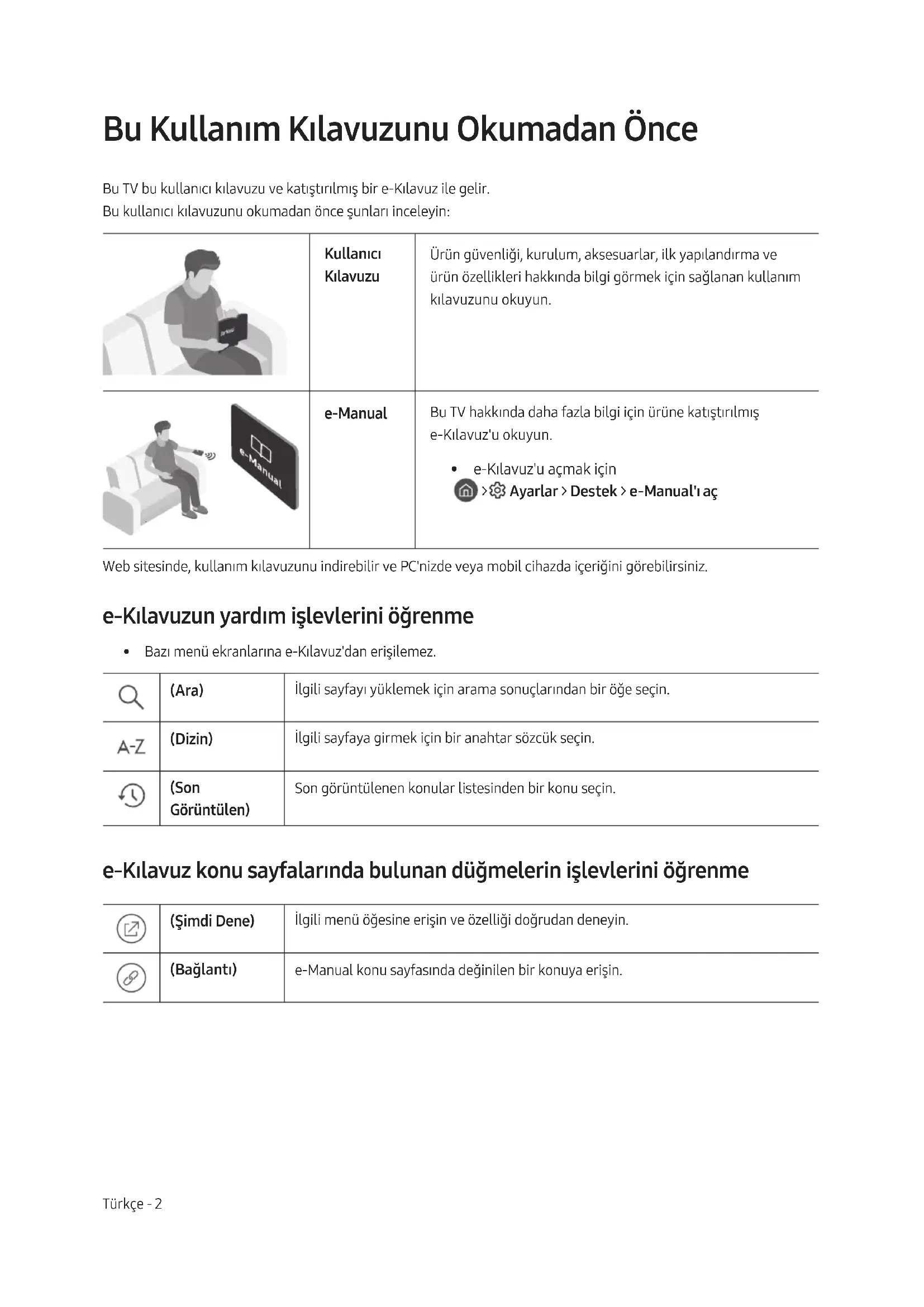 - Bazı menü ekranlarına e-Kılavuz'dan erişilemez. (Ara) İlgili sayfayı yüklemek için arama sonuçlarından bir öğe seçin. (Dizin) İlgili sayfaya girmek için bir anahtar sözcük seçin. (Son Görüntülen) Son görüntülenen konular listesinden bir konu seçin. e-Kılavuz konu sayfalarında bulunan düğmelerin işlevlerini öğrenme (Şimdi Dene) İlgili menü öğesine erişin ve özelliği doğrudan deneyin. (Bağlantı) e-Manual konu sayfasında değinilen bir konuya erişin.Türkçe - 2 Türkçe - 3 Türkçe Uyarı! Önemli Güvenlik Talimatları TV'nizi kullanmadan önce lütfen Güvenlik Talimatlarını okuyun. DİKKAT Sınıf II ürün: Bu sembol, elektrik topraklamasına (toprak) bir güvenlik bağlantısı gerekmediğini gösterir. ELEKTRİK ÇARPMASI RİSKİ. AÇMAYIN. DİKKAT: ELEKTRİK ÇARPMASI RİSKİNİ AZALTMAK
