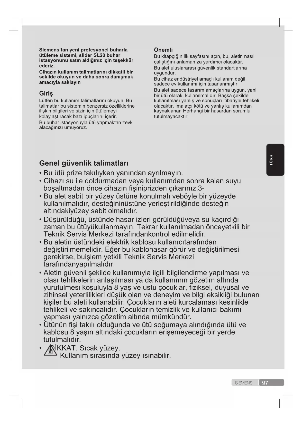 - DİKKAT. Sıcak yüzey. Kullanım sırasında yüzey ısınabilir.98 S I E M E N S TÜRK Tanıtım