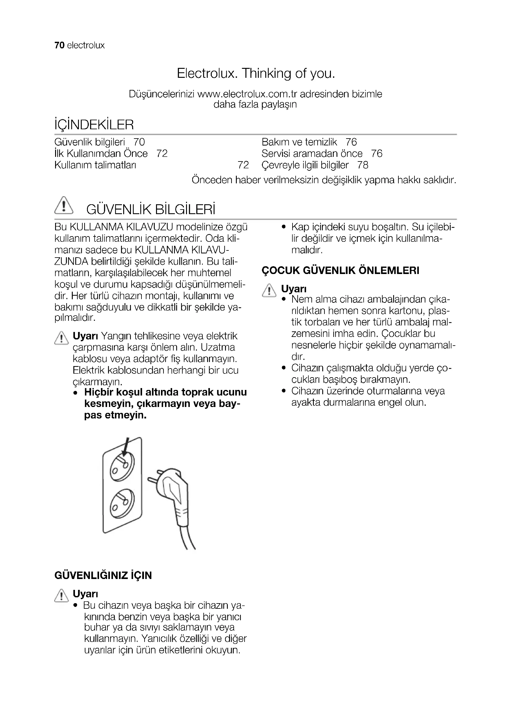 Bu KULLANMA KILAVUZU modelinize özgü kullanım talimatlarını içermektedir. Oda kli- manızı sadece bu KULLANMA KILAVU- ZUNDA belirtildiği şekilde kullanın. Bu tali- matların, karşılaşılabilecek her muhtemel koşul ve durumu kapsadığı düşünülmemeli- dir. Her türlü cihazın montajı, kullanımı ve bakımı sağduyulu ve dikkatli bir şekilde ya- pılmalıdır. Uyarı Yangın tehlikesine veya elektrik çarpmasına karşı önlem alın. Uzatma kablosu veya adaptör fiş kullanmayın. Elektrik kablosundan herhangi bir ucu çıkarmayın.