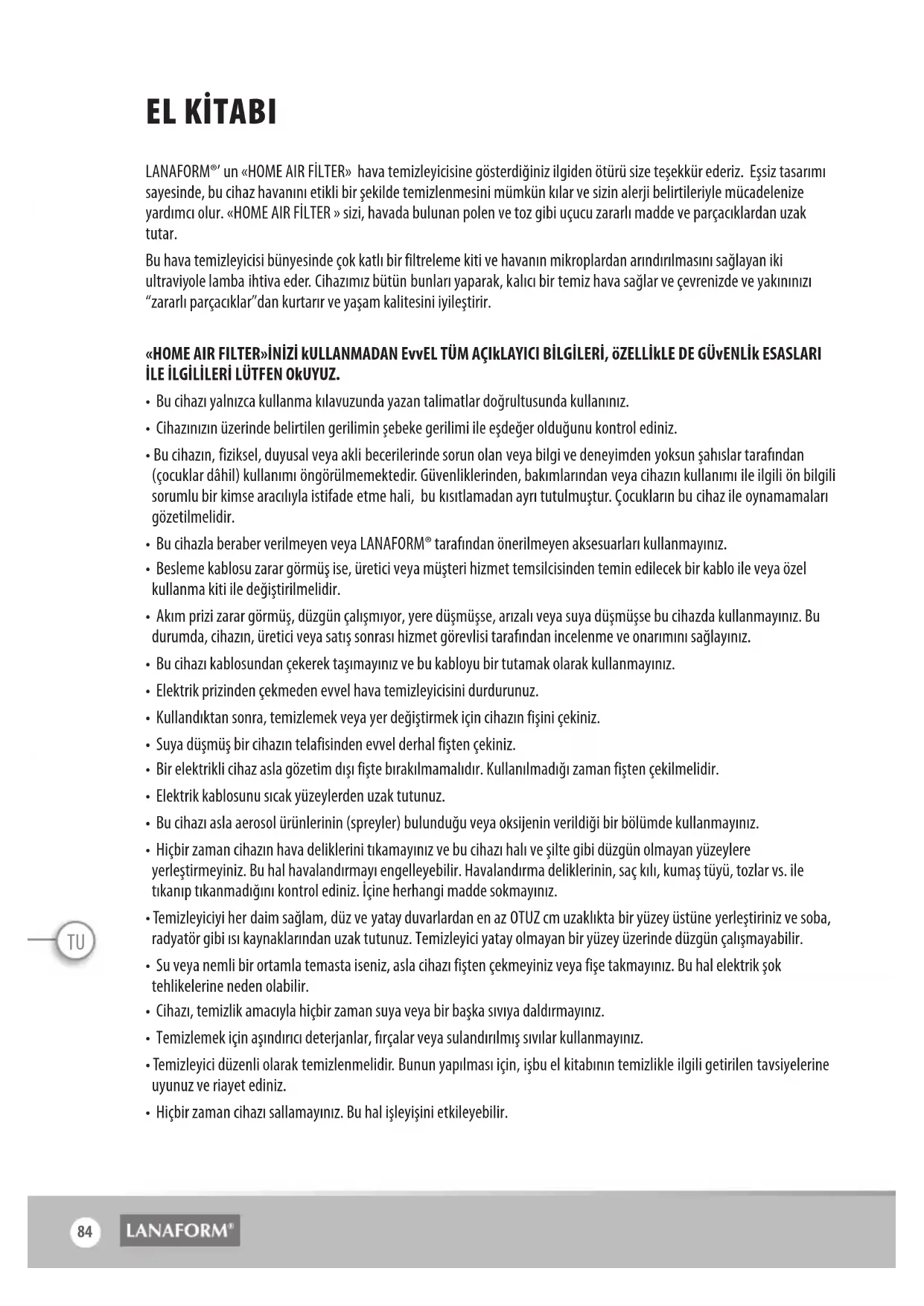 LANAFORM®’ un «HOME AIR FİLTER» hava temizleyicisine gösterdiğiniz ilgiden ötürü size teşekkür ederiz. Eşsiz tasarımı sayesinde, bu cihaz havanını etikli bir şekilde temizlenmesini mümkün kılar ve sizin alerji belirtileriyle mücadelenize yardımcı olur. «HOME AIR FİLTER » sizi, havada bulunan polen ve toz gibi uçucu zararlı madde ve parçacıklardan uzak tutar. Bu hava temizleyicisi bünyesinde çok katlı bir filtreleme kiti ve havanın mikroplardan arındırılmasını sağlayan iki ultraviyole lamba ihtiva eder. Cihazımız bütün bunları yaparak, kalıcı bir temiz hava sağlar ve çevrenizde ve yakınınızı “zararlı parçacıklar”dan kurtarır ve yaşam kalitesini iyileştirir. «HOME AIR FILTER»İNİZİ kULLANMADAN EvvEL TÜM AÇIkLAYICI BİLGİLERİ, öZELLİkLE DE GÜvENLİk ESASLARI İLE İLGİLİLERİ LÜTFEN OkUYUZ.