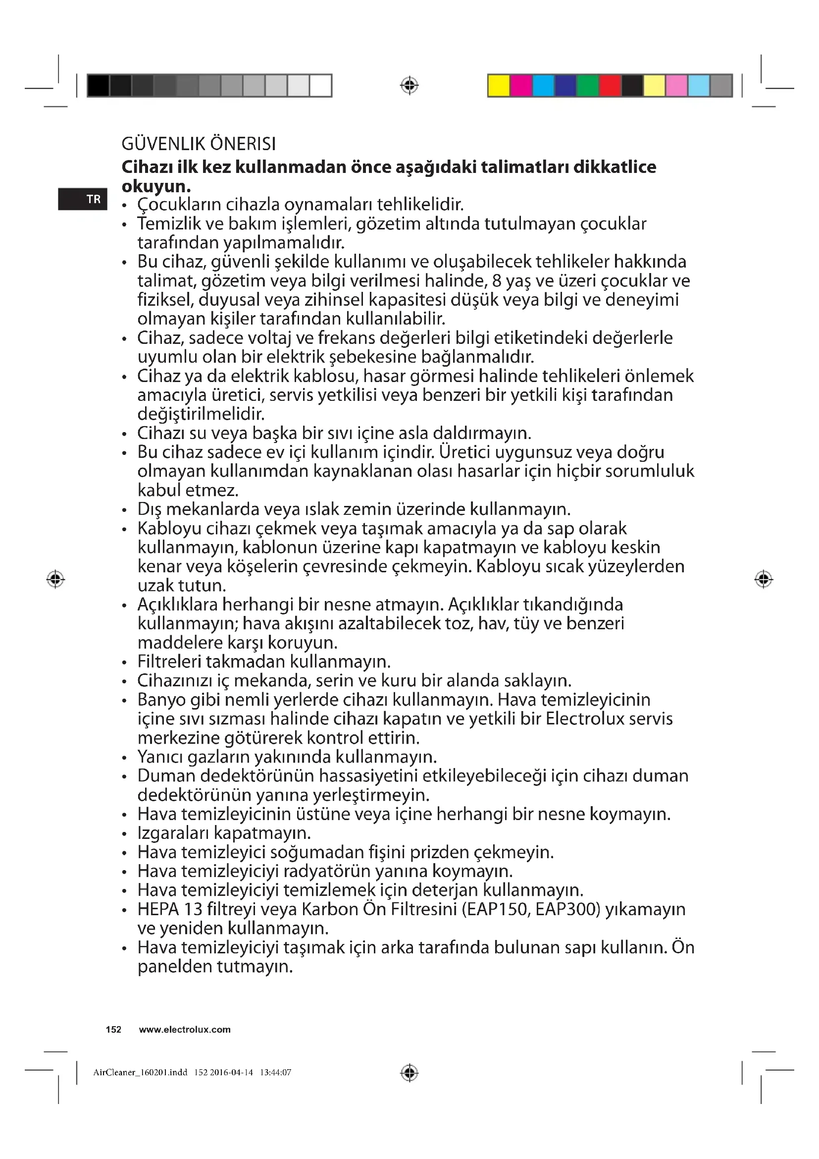 EAP150, EAP300, EAP450Sorun Olası nedenler / çözüm Filtremi yıkayabilir miyim? Hayır. Cihazla birlikte sunulan ltreler, ıslandığında parçalanır ve kullanılamaz hale gelir. (EAP450 modeline ait ltreler yıkanabilir)Filtremi elektrik süpürgesiyle temizleyebilir miyim? Hayır. Elektrik süpürgesi, tozların havaya yayılmasına neden olur. Filtrenin çok kirli olduğunu düşünüyorsanız değiştirme zamanı gelmiş olabilir. (EAP450 modeline ait Yıkanabilir Ön Filtre, elektrik süpürgesi veya yumuşak bir fırçayla temizlenebilir.) Cihazdan bir koku geliyordu, içini açtım. Cihaz, mukavva ve plastik bir ambalajla sıkıca sarılmıştı. Cihazda fan bulunduğundan ve havayı çektiğinden dolayı bazı “daha önce karşılaşılmamış” kokular çıkarabilir. Cihazın duyarlılığına ve kullanıldığı süreye bağlı olarak bu kokular birkaç gün veya bir hafta içinde kendiliğinden yok olur.Cihaz, derecelendirildiği alandan daha büyük bir alanı temizleyebilir mi? CADR dereceleri kontrollü bir test ortamından alınır. Bu ortam değiştiğinde performans etkilenebilir. Ancak cihaz CADR derecesinde belirtilenden daha büyük bir odada kullanılacaksa havayı temizlemesi normalden biraz daha uzun sürebilir. Cihazı nereye koymalıyım? Cihazın yanlarında ve ön kısmında gerekli hava dolaşımının sağlandığından emin olun. Kapılar veya dar koridorlar hava temizleyiciye gelen hava akımını azaltsa da cihazın yakınlarında haf bir sirkülasyon olacaktır. AIR QUALITY ışığı turuncu veya kırmızı renkte yanıyor, ama hava temiz görünüyor.Sensör tıkanmış olabilir. Elektrik süpürgesiyle temizleyin. Bazen sıkıştırılmış hava sensörün tozla tıkanmasına neden olabilir. Havada veya mobilyalarımda hala bir miktar toz görünüyor Cihaz, toz ve partiküllerin büyük bölümünü toplar; ancak açık kapılar, pencereler, merkezi HVAC gibi etkenlerden dolayı havada bir miktar toz görülebilir.Filtrelerin sabitlenmesini sağlayacak bir mekanizma yok Filtreler cihazın içinde yer alır. Cihaz açıldığında, cihazın çektiği havanın kuvvetiyle ltreler sıkıca yerlerine sabitlenir.Fan motorunun çok yüksek devirle döndüğünü duyabiliyorum Bu normal bir durumdur. Özellikle tüm ortamlarda sessizliğin hakim olduğu geç saatlerde motorun devir seslerini duyabilirsiniz.Cihaz kokuları artık etkin bir şekilde gideremiyor veya bir koku yayıyor. Hava kalitesi sensörünün tıkanıp tıkanmadığını kontrol edin. Cihazı rahatsızlık veren koku kaynaklarının yakınına getirin. Kirleri emme kapasitesine ulaşmış olabileceğinden dolayı ltreleri değiştirin. Filtreleri daha sık aralıklarla değiştirmeniz gerekebilir. CHECK FILTER göstergesi, HEPA ltre değiştirildikten sonra da yanmaya devam ediyor. RESET FILTER deliğine dikkatlice bir ataş takarak RESET FILTER düğmesine basın. Cihazın sıfırlandığını belirten “bip” sesi duyulana dek düğmeyi 3-5 saniye basılı tutun. www.electrolux.com