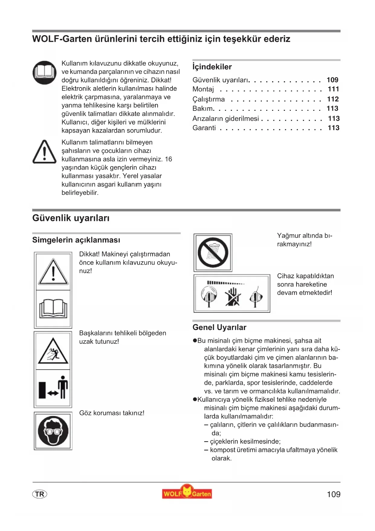 - Makine üzerindeki onarimal sadece WOLF-Garten servis istasyonlari ve yetkili servislerce erfolgkeleşirilmelidir.