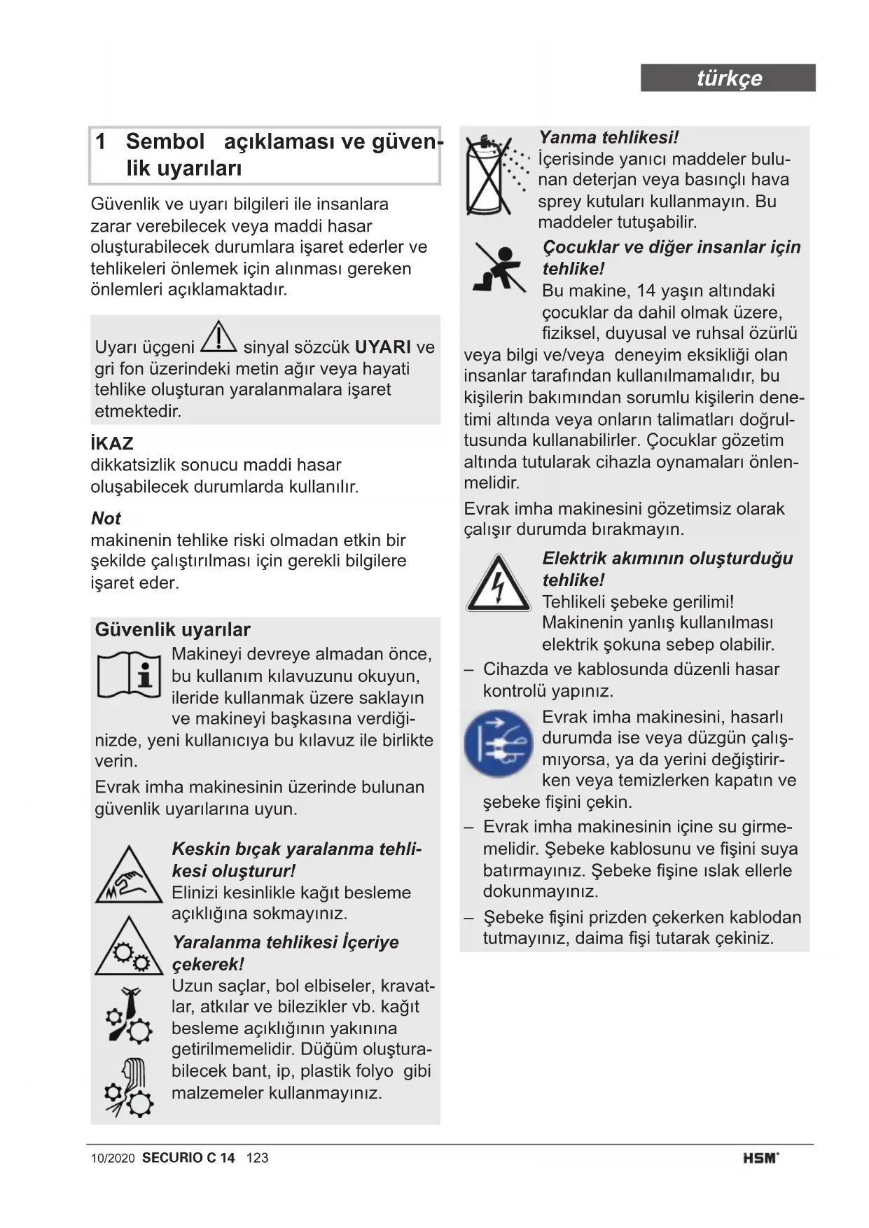 Ağırlık 4,0 kg 4,5 kg Kapaste maks. yaprak sayısında 160 W (EU) / 145 W (US) Ses sevyes (boşta çalışırken / yük altında) 55-60 dB(A) / 60-65 dB(A) 55-60 dB(A) / 65-70 dB(A) Çalışma genşlğ 225 mm Kesme hızı 44 mm/s Bağlantı 220-240 V / 50/60 Hz 110-130 V / 60 Hz Enerj tüketm stand-by modunda < 2 Wh Çalışma süres 15 dakkaya kadar İşletmedek ortam koşulları: Sıcaklık bağıl nem Denz sevyesnden yükseklk -10 °C le +25 °C arası maks. % 90, yoğuş masız maks. 2.000 m Boyutlar G x D x Y (mm) 366 x 258 x 405 Toplama haznesnn hacm 20 l A- değerlendrmel ses gücü sevyes (rölantdek LWAd değer) 65,9 dB türkçe128 SECURIO C 14 10/2020 1 标识说明与安全提示 安全和危险提示用以标明可能会造成人身伤 害或财产损失的情况,并列出避免危险发生