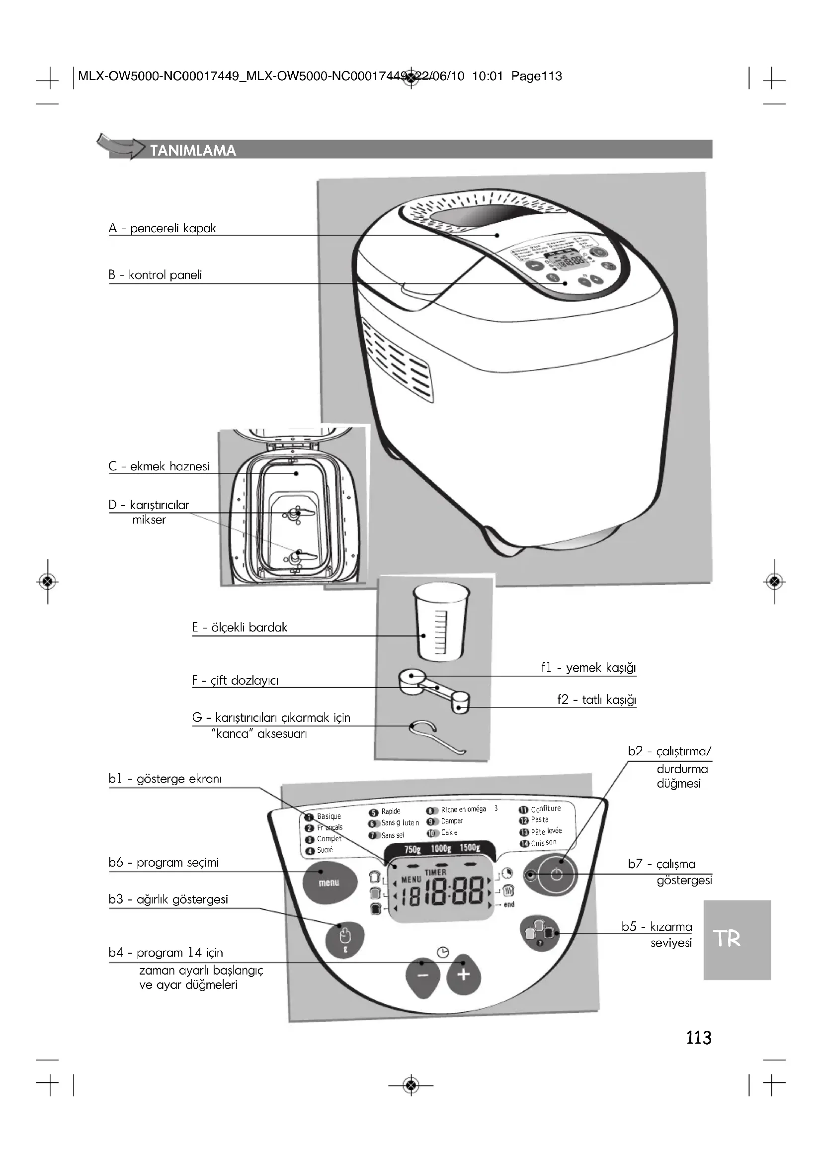 Pâte levée Cuis son A - pencereli kapak b6 - program seçimi b4 - program 14 için zaman ayarlı başlangıç ve ayar düğmeleri b1 - gösterge ekranı b3 - ağırlık göstergesi b2 - çalıştırma/ durdurma düğmesi b7 - çalışma göstergesi b5 - kızarma seviyesi B - kontrol paneli C - ekmek haznesi D - karıştırıcılar mikser E - ölçekli bardak F - çift dozlayıcı f1 - yemek kaşığı f2 - tatlı kaşığı G - karıştırıcıları çıkarmak için “kanca” aksesuarı MLX-OW5000-NC00017449_MLX-OW5000-NC00017449 22/06/10 10:01 Page113114