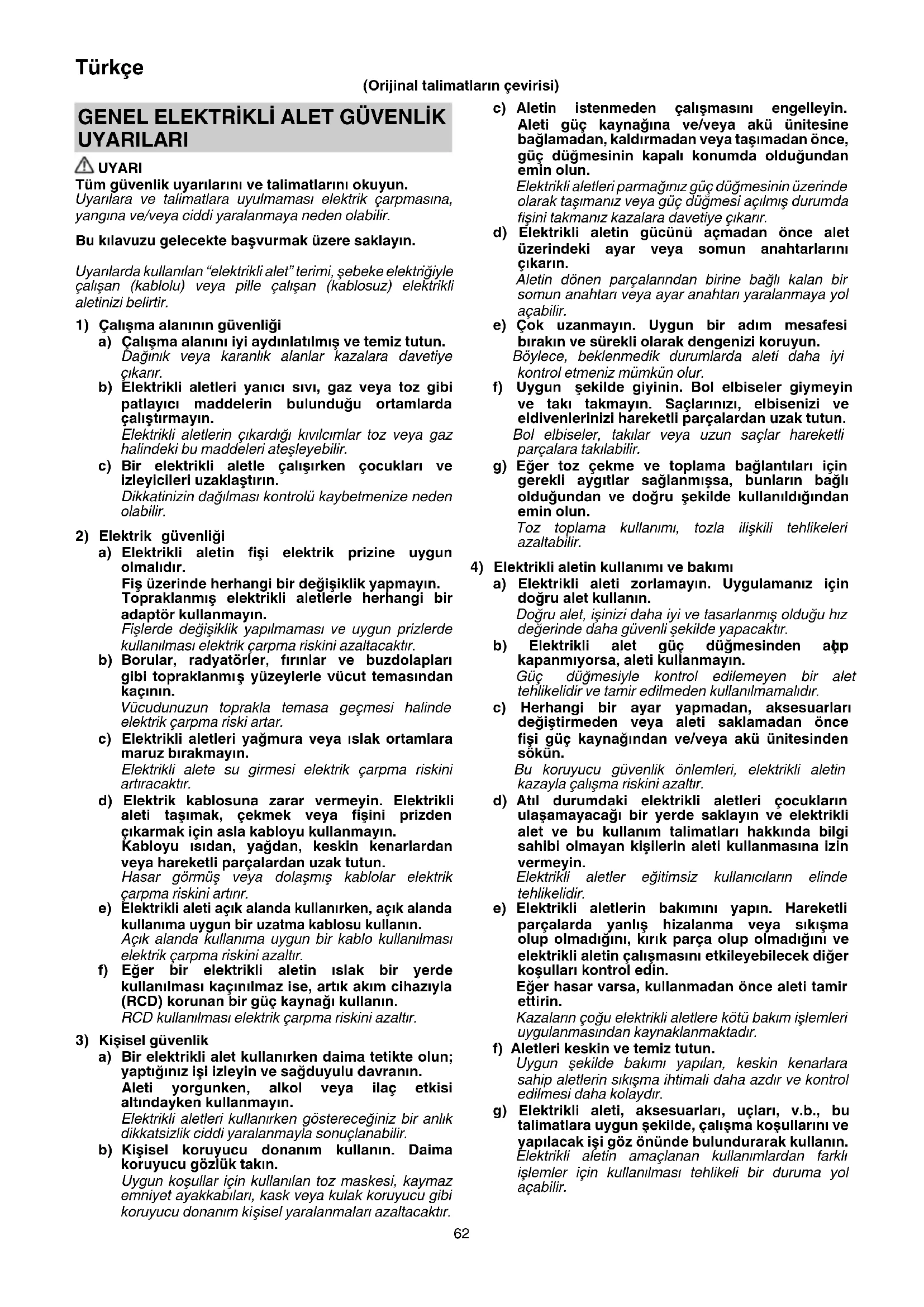 a) Elektrikli aleti zorlamayın. Uygulamanız için doğru alet kullanın. Doğru alet, işinizi daha iyi ve tasarlanmış olduğu hız değerinde daha güvenli şekilde yapacaktır. b) Elektrikli alet güç düğmesinden açı lıp kapanmıyorsa, aleti kullanmayın. Güç düğmesiyle kontrol edilemeyen bir alet tehlikelidir ve tamir edilmeden kullanılmamalıdır. c) Herhangi bir ayar yapmadan, aksesuarları değiştirmeden veya aleti saklamadan önce fi şi güç kaynağından ve/veya akü ünitesinden sökün. Bu koruyucu güvenlik önlemleri, elektrikli aletin kazayla çalışma riskini azaltır. d) Atıl durumdaki elektrikli aletleri çocukların ulaşamayacağı bir yerde saklayın ve elektrikli alet ve bu kullanım talimatları hakkında bilgi sahibi olmayan kişilerin aleti kullanmasına izin vermeyin. Elektrikli aletler eğitimsiz kullanıcıların elinde tehlikelidir. e) Elektrikli aletlerin bakımını yapın. Hareketli parçalarda yanlış hizalanma veya sıkışma olup olmadığını , kırık parça olup olmadığını ve elektrikli aletin çalışmasını etkileyebilecek diğer koşulları kontrol edin. Eğer hasar varsa, kullanmadan önce aleti tamir ettirin. Kazaların çoğu elektrikli aletlere kötü bakım işlemleri uygulanmasından kaynaklanmaktadır. f) Aletleri keskin ve temiz tutun. Uygun şekilde bakımı yapılan, keskin kenarlara sahip aletlerin sıkışma ihtimali daha azdır ve kontrol edilmesi daha kolaydır. g) Elektrikli aleti, aksesuarları, uçları, v.b., bu talimatlara uygun şekilde, çalışma koşullarını ve yapılacak işi göz önünde bulundurarak kullanın. Elektrikli aletin amaçlanan kullanımlardan farklı işlemler için kullanılması tehlikeli bir duruma yol açabilir. GENEL ELEKTRİKLİ ALET GÜVENLİK UYARILARI UYARI Tüm güvenlik uyarılarını ve talimatlarını okuyun. Uyarılara ve talimatlara uyulmaması elektrik çarpmasına, yangına ve/veya ciddi yaralanmaya neden olabilir. Bu kılavuzu gelecekte başvurmak üzere saklayın. Uyarılarda kullanılan “elektrikli alet” terimi, şebeke elektriğiyle çalışan (kablolu) veya pille çalışan (kablosuz) elektrikli aletinizi belirtir.