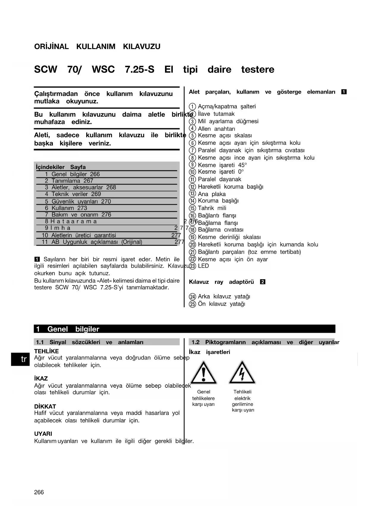Printed: 14.05.2014 | Doc-Nr: PUB / 5070536 / 000 / 02ORİJİNAL KULLANIM KILAVUZU SCW 70/ WSC 7.25‑S El tipi daire testere Çalıştırmadan önce kullanım kılavuzunu mutlaka okuyunuz. Bu kullanım kılavuzunu daima aletle birlikte muhafaza ediniz. Aleti, sadece kullanım kılavuzu ile birlikte başka kişilere veriniz. İçindekiler Sayfa1 Genel bilgiler 2662 Tanımlama 2673 Aletler, aksesuarlar 2684 Teknik veriler 2695 Güvenlik uyarıları 2706 Kullanım 2737 Bakım ve onarım 2768Hataarama 2769İmha 27710 Aletlerin üretici garantisi 27711 AB Uygunluk açıklaması (Orijinal) 277 1 Sayıların her biri bir resmi işaret eder. Metin ile ilgili resimleri açılabilen sayfalarda bulabilirsiniz. Kılavuzuokurken bunu açık tutunuz. Bu kullanım kılavuzunda »Alet« kelimesi daima el tipi daire testere SCW 70/ WSC 7.25-S'yi tanımlamaktadır.Alet parçaları, kullanım ve gösterge elemanları 1 Açma/kapatma şalteri İlave tutamak Mil ayarlama düğmesi Allen anahtarı Kesme açısı skalası Kesme açısı ayarı için sıkıştırma kolu Paralel dayanak için sıkıştırma cıvatası Kesme açısı ince ayarı için sıkıştırma kolu Kesme işareti 45° Kesme işareti 0° Paralel dayanak Hareketli koruma başlığı Ana plaka Koruma başlığı Tahrik mili Bağlantı flanşı Bağlama flanşı Bağlama cıvatası Kesme derinliği skalası Hareketli koruma başlığı için kumanda kolu Bağlantı parçaları (toz emme tertibatı) Kesme açısı için ön ayar