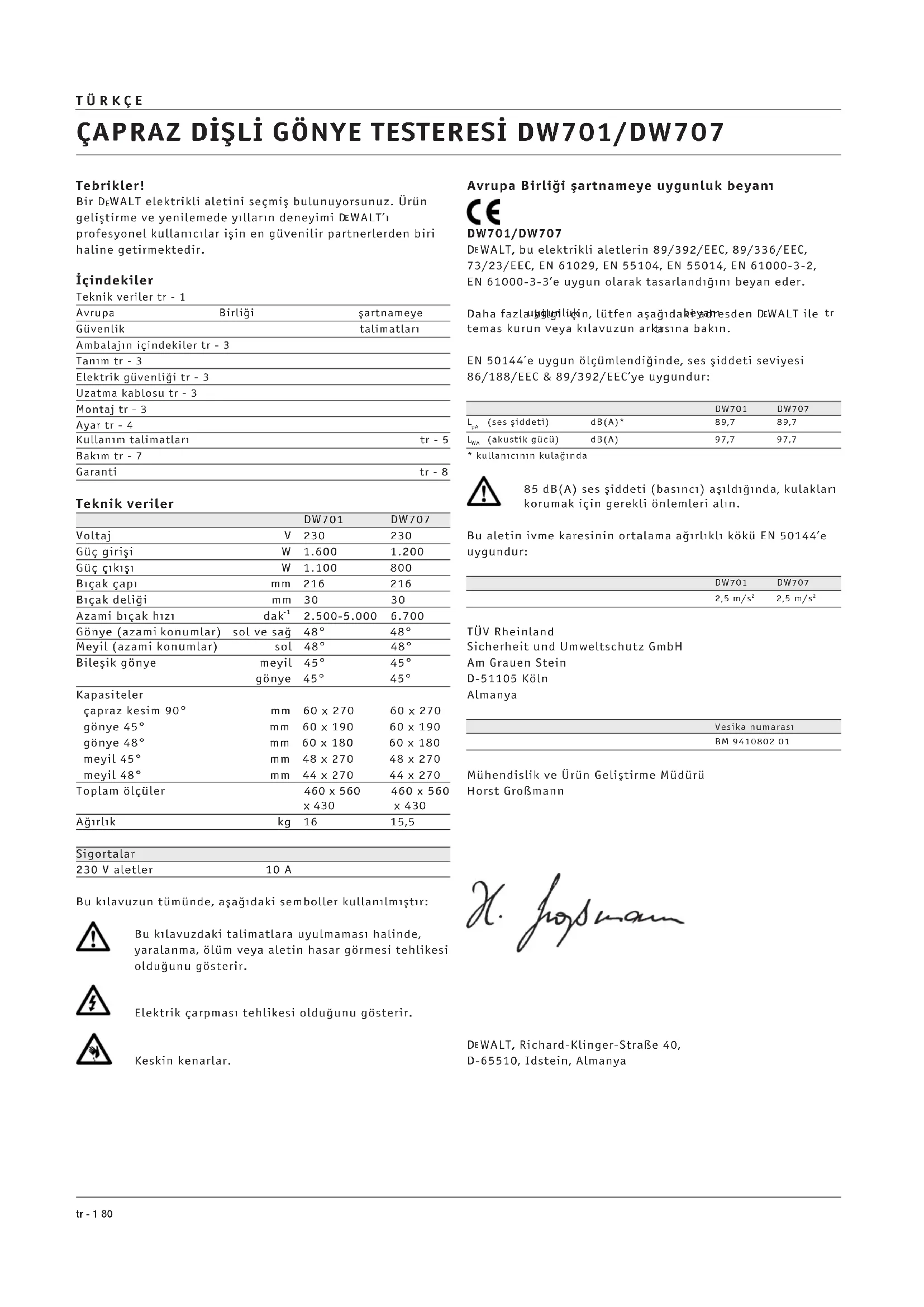 2.500-5.000 6.700 Gönye (azami konumlar) sol ve sağ 48° 48° Meyil (azami konumlar) sol 48° 48° Bileşik gönye meyil 45° 45° gönye 45° 45° Kapasiteler çapraz kesim 90° mm 60 x 270 60 x 270 gönye 45° mm 60 x 190 60 x 190 gönye 48° mm 60 x 180 60 x 180 meyil 45° mm 48 x 270 48 x 270 meyil 48° mm 44 x 270 44 x 270 Toplam ölçüler 460 x 560 460 x 560 x 430 x 430 Ağrlk kg 16 15,5 Sigortalar 230 V aletler 10 A Bu klavuzun tümünde, aşağdaki semboller kullanlmştr: Bu klavuzdaki talimatlara uyulmamas halinde, yaralanma, ölüm veya aletin hasar görmesi tehlikesi olduğunu gösterir. Elektrik çarpmas tehlikesi olduğunu gösterir. Keskin kenarlar. Avrupa Birliği şartnameye uygunluk beyan DW701/DW707
