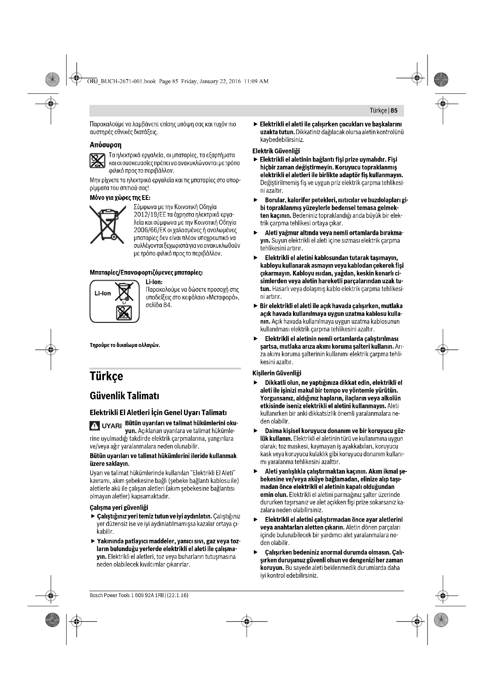 Τα ηλεκτρικά εργαλεία, οι μπαταρίες, τα εξαρτήματα και οι συσκευασίες πρέπει να ανακυκλώνονται με τρόπο φιλικό προς το περιβάλλον. Μην ρίχνετε τα ηλεκτρικά εργαλεία και τις μπαταρίες στα απορ- ρίμματα του σπιτιού σας! Μόνο για χώρες της ΕΕ: Σύμφωνα με την Κοινοτική Οδηγία 2012/19/EE τα άχρηστα ηλεκτρικά εργα- λεία και σύμφωνα με την Κοινοτική Οδηγία 2006/66/EΚ οι χαλασμένες ή αναλωμένες μπαταρίες δεν είναι πλέον υποχρεωτικό να συλλέγονται ξεχωριστά για να ανακυκλωθούν με τρόπο φιλικό προς το περιβάλλον. Μπαταρίες/Επαναφορτιζόμενες μπαταρίες: Li-Ion: Παρακαλούμε να δώσετε προσοχή στις υποδείξεις στο κεφάλαιο «Μεταφορά», σελίδα 84. Τηρούμε το δικαίωμα αλλαγών. Türkçe Güvenlik Talimatı Elektrikli El Aletleri İçin Genel Uyarı Talimatı Bütün uyarıları ve talimat hükümlerini oku- yun. Açıklanan uyarılara ve talimat hükümle- rine uyulmadığı takdirde elektrik çarpmalarına, yangınlara ve/veya ağır yaralanmalara neden olunabilir. Bütün uyarıları ve talimat hükümlerini ileride kullanmak üzere saklayın. Uyarı ve talimat hükümlerinde kullanılan “Elektrikli El Aleti” kavramı, akım şebekesine bağlı (şebeke bağlantı kablosu ile) aletlerle akü ile çalışan aletleri (akım şebekesine bağlantısı olmayan aletler) kapsamaktadır. Çalışma yeri güvenliği Çalıştığınız yeri temiz tutun ve iyi aydınlatın. Çalıştığınız yer düzensiz ise ve iyi aydınlatılmamışsa kazalar ortaya çı- kabilir. Yakınında patlayıcı maddeler, yanıcı sıvı, gaz veya toz- ların bulunduğu yerlerde elektrikli el aleti ile çalışma- yın. Elektrikli el aletleri, toz veya buharların tutuşmasına neden olabilecek kıvılcımlar çıkarırlar. Elektrikli el aleti ile çalışırken çocukları ve başkalarını uzakta tutun. Dikkatiniz dağılacak olursa aletin kontrolünü kaybedebilirsiniz. Elektrik Güvenliği Elektrikli el aletinin bağlantı fişi prize uymalıdır. Fişi hiçbir zaman değiştirmeyin. Koruyucu topraklanmış elektrikli el aletleri ile birlikte adaptör fiş kullanmayın. Değiştirilmemiş fiş ve uygun priz elektrik çarpma tehlikesi- ni azaltır. Borular, kalorifer petekleri, ısıtıcılar ve buzdolapları gi- bi topraklanmış yüzeylerle bedensel temasa gelmek- ten kaçının. Bedeniniz topraklandığı anda büyük bir elek- trik çarpma tehlikesi ortaya çıkar. Aleti yağmur altında veya nemli ortamlarda bırakma- yın. Suyun elektrikli el aleti içine sızması elektrik çarpma tehlikesini artırır. Elektrikli el aletini kablosundan tutarak taşımayın, kabloyu kullanarak asmayın veya kablodan çekerek fişi çıkarmayın. Kabloyu ısıdan, yağdan, keskin kenarlı ci- simlerden veya aletin hareketli parçalarından uzak tu- tun. Hasarlı veya dolaşmış kablo elektrik çarpma tehlikesi- ni artırır. Bir elektrikli el aleti ile açık havada çalışırken, mutlaka açık havada kullanılmaya uygun uzatma kablosu kulla- nın. Açık havada kullanılmaya uygun uzatma kablosunun kullanılması elektrik çarpma tehlikesini azaltır. Elektrikli el aletinin nemli ortamlarda çalıştırılması şartsa, mutlaka arıza akımı koruma şalteri kullanın. Arı- za akımı koruma şalterinin kullanımı elektrik çarpma tehli- kesini azaltır. Kişilerin Güvenliği Dikkatli olun, ne yaptığınıza dikkat edin, elektrikli el aleti ile işinizi makul bir tempo ve yöntemle yürütün. Yorgunsanız, aldığınız hapların, ilaçların veya alkolün etkisinde iseniz elektrikli el aletini kullanmayın. Aleti kullanırken bir anki dikkatsizlik önemli yaralanmalara ne- den olabilir. Daima kişisel koruyucu donanım ve bir koruyucu göz- lük kullanın. Elektrikli el aletinin türü ve kullanımına uygun olarak; toz maskesi, kaymayan iş ayakkabıları, koruyucu kask veya koruyucu kulaklık gibi koruyucu donanım kullanı- mı yaralanma tehlikesini azalttır. Aleti yanlışlıkla çalıştırmaktan kaçının. Akım ikmal şe- bekesine ve/veya aküye bağlamadan, elinize alıp taşı- madan önce elektrikli el aletinin kapalı olduğundan emin olun. Elektrikli el aletini parmağınız şalter üzerinde dururken taşırsanız ve alet açıkken fişi prize sokarsanız ka- zalara neden olabilirsiniz. Elektrikli el aletini çalıştırmadan önce ayar aletlerini veya anahtarları aletten çıkarın. Aletin dönen parçaları içinde bulunabilecek bir yardımcı alet yaralanmalara ne- den olabilir. Çalışırken bedeniniz anormal durumda olmasın. Çalı- şırken duruşunuz güvenli olsun ve dengenizi her zaman koruyun. Bu sayede aleti beklenmedik durumlarda daha iyi kontrol edebilirsiniz. UYARI OBJ_BUCH-2671-001.book Page 85 Friday, January 22, 2016 11:09 AM86 | Türkçe 1 609 92A 1RB | (22.1.16) Bosch Power Tools Uygun iş elbiseleri giyin. Geniş giysiler giymeyin ve ta- kı takmayın. Saçlarınızı, giysileriniz ve eldivenlerinizi aletin hareketli parçalarından uzak tutun. Bol giysiler, uzun saçlar veya takılar aletin hareketli parçaları tarafından tutulabilir. Toz emme donanımı veya toz tutma tertibatı kullanır- ken, bunların bağlı olduğundan ve doğru kullanıldığın- dan emin olun. Toz emme donanımının kullanımı tozdan kaynalanabilecek tehlikeleri azaltır. Elektrikli el aletlerinin özenle kullanımı ve bakımı Aleti aşırı ölçede zorlamayın. Yaptığınız işe uygun elek- trikli el aletleri kullanın. Uygun performanslı elektrikli el aleti ile, belirlenen çalışma