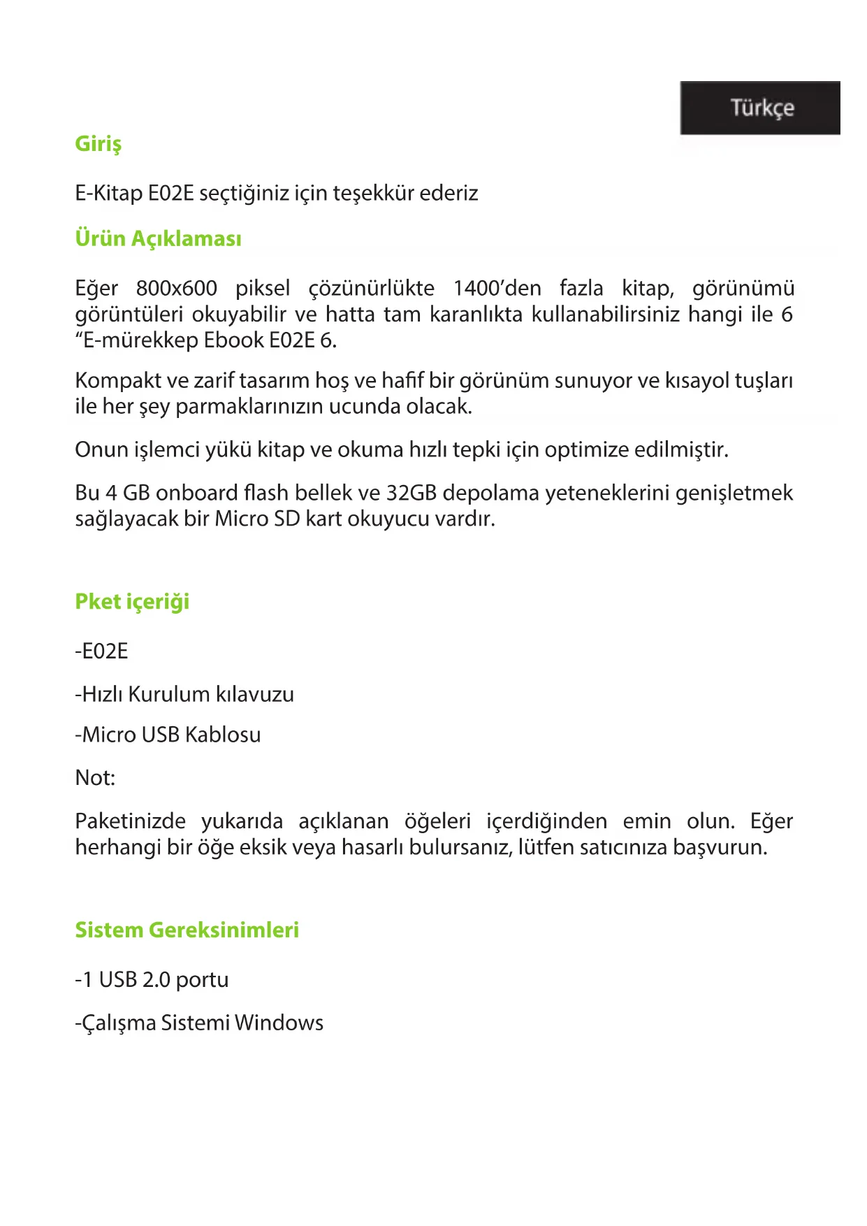 Z hlavnej ponuky vyberte položku Používateľská príručka a stlačte klávesu Enter. Návod na použitie eBook sa otvorí Technická podpora Pre viac informácií o tomto produkte nájdete v sekcii podpory na našich webových stránkach www.billowtechnology.com alebo poslať e-mail na Support@billowtechnology.comGiriş E-Kitap E02E seçtiğiniz için teşekkür ederiz Ürün Açıklaması Eğer 800x600 piksel çözünürlükte 1400’den fazla kitap, görünümü görüntüleri okuyabilir ve hatta tam karanlıkta kullanabilirsiniz hangi ile 6 “E-mürekkep Ebook E02E 6. Kompakt ve zarif tasarım hoş ve haf bir görünüm sunuyor ve kısayol tuşları ile her şey parmaklarınızın ucunda olacak. Onun işlemci yükü kitap ve okuma hızlı tepki için optimize edilmiştir. Bu 4 GB onboard ash bellek ve 32GB depolama yeteneklerini genişletmek sağlayacak bir Micro SD kart okuyucu vardır. Pket içeriği -E02E -Hızlı Kurulum kılavuzu -Micro USB Kablosu Not: Paketinizde yukarıda açıklanan öğeleri içerdiğinden emin olun. Eğer herhangi bir öğe eksik veya hasarlı bulursanız, lütfen satıcınıza başvurun. Sistem Gereksinimleri -1 USB 2.0 portu -Çalışma Sistemi WindowsParça açıklama