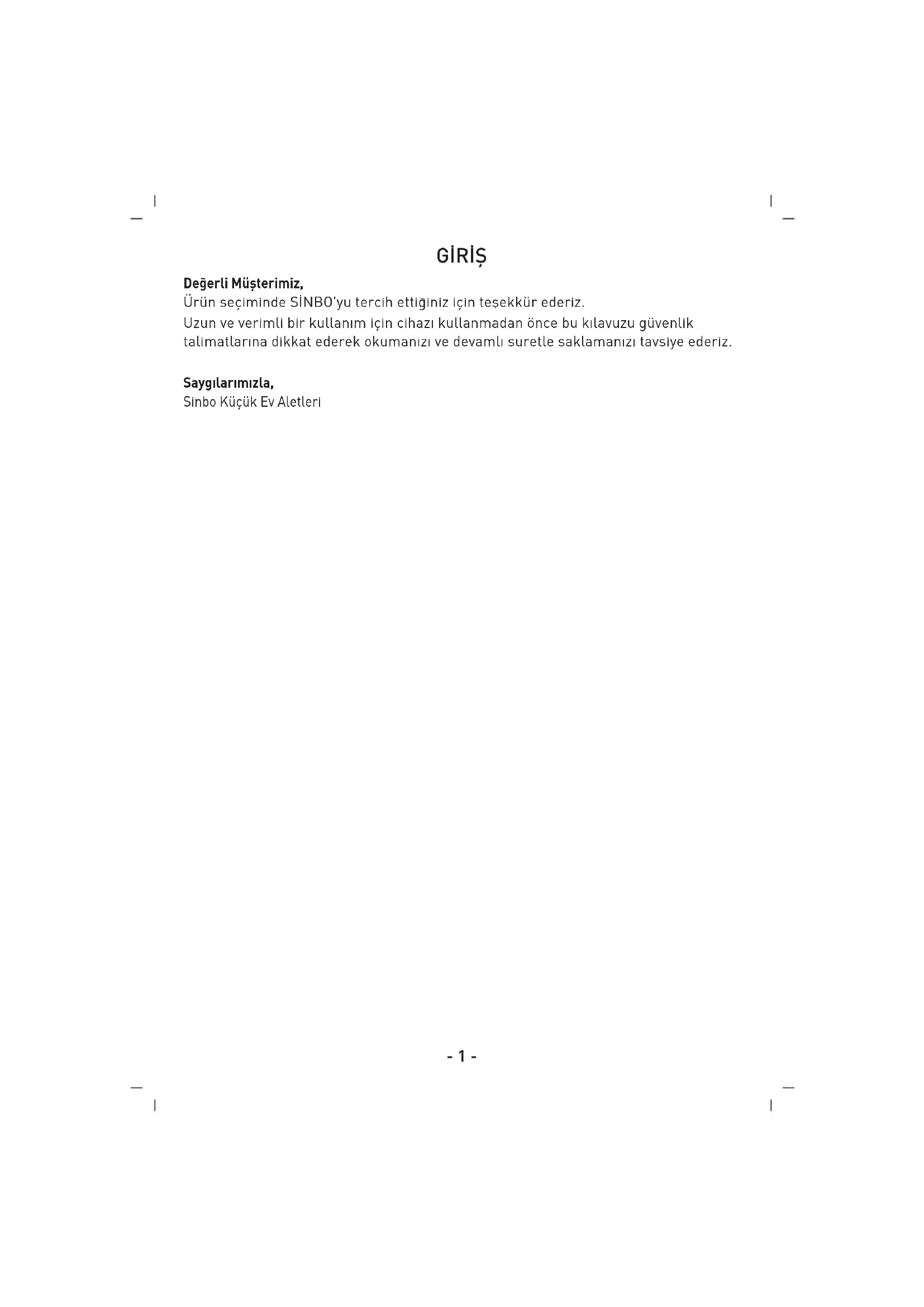 PT- 1 - G‹R‹fi De¤erli Müflterimiz, Ürün seçiminde S‹NBO'yu tercih etti¤iniz için teflekkür ederiz. Uzun ve verimli bir kullan›m için cihaz› kullanmadan önce bu k›lavuzu güvenlik talimatlar›na dikkat ederek okuman›z› ve devaml› suretle saklaman›z› tavsiye ederiz. Sayg›lar›m›zla, Sinbo Küçük Ev AletleriSINBO SKS 4507