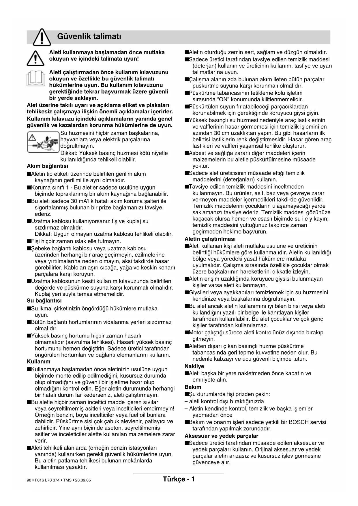 F016 L70 374 - book Seite 3 Mittwoch, 19. Oktober 2005 2:20 1492 • F016 L70 374 • TMS • 28.09.05Türkçe - 4 Çal∂µt∂rma Ωebeke µalterinin ( ) konumunda olduπundan emin olduktan sonra aleti prize tak∂n. Su musluπunu aç∂n. Tetiπi 2 serbest b∂rakmak için kapama emniyetine 1 bas∂n. Su düzenli olarak akmaya baµlay∂ncaya ve alet ile yüksek bas∂nç hortumunda hiç hava kalmay∂ncaya kadar tetiπe 2 sonuna kadar bas∂n. Tetiπi 2 b∂rak∂n. Kapama emniyetine 1 bas∂n. Ωebeke µalteri 12 düπmesine ( ) bas∂n. Püskürtme tabancas∂n∂ 4 aµaπ∂ doπrultun. Tetiπi 2 boµa almak için tetik emniyetine bas∂n. Tetiπe 2 sonuna kadar bast∂r∂n. Kapama Tetiπi 2 b∂rak∂n. Tetik emniyetine bas∂n. Bu durumda püskürtme tabancas∂ kililenir ve yanl∂µl∂kla da olsa çal∂µmaz. Ωebeke µalterinin 12 düπmesine( ) bas∂n. Su musluπunu kapat∂n. Fiµi prizden çekin. Tetiπi 2 serbest b∂rakmak için kapama emniyetine 1 bas∂n. Alet içinde hiç su bas∂nc∂ kalmay∂ncaya kadar tetiπe 2 sonuna kadar bas∂n. Tetiπi 2 b∂rak∂n. Kapama emniyetine 1 bas∂n. Su hortumunu aletten ve su baπlant∂ yerinden al∂n. Genel Aletin düz bir zemin üzerinde durmas∂na dikkat edin. Yüksek bas∂nç hortumu ile çok uzaπa gitmeyin veya aleti hortumdan tutarak çekmeyin. Aksi takdirde alet duruµ güvenliπini kaybedebilir ve devrilebilir. Yüksek bas∂nç hortumunun k∂r∂lmamas∂na (bükülmemesine) dikkat edin ve araçlar üzerinden geçmeyin. Yüksek bas∂nç hortumunu keskin kenarl∂ cisimlerden ve köµelerden koruyun. Döner huzmeli bas∂nçl∂ boruyu otomobil y∂kamak için kullanmay∂n. Temizlik maddeleri ile çal∂µma Sadece Bosch'un müsaade ettiπi temizlik maddesi kullan∂n. Uygun olmayan temizlik maddeleri alete ve temizlenen malzemeye zarar verebilir. Temizlik maddesi deposunu 8 temizlik maddesi ile doldurun; temizli maddesini önceden tavsiye edildiπi gibi inceltin. Temizlik maddesini püskürtmek üzere yelpaze biçimli huzme ucunu düµük bas∂nç pozisyonuna getirin. Çevre dostu çal∂µabilmeniz için temizlik maddesini tasarruflu kullanman∂z∂ tavsiye ederiz. Temizlik maddesinin inceltilmesine iliµkin hazne üzerindeki tavsiyelere uyun. Kaliteli ve seçkin temizleme ve koruma maddesi kullan∂ld∂π∂nda Bosch aletin ar∂zas∂z ve kusursuz çal∂µacaπ∂n∂ garanti eder. Tavsiye edilen temizleme yöntemleri Ad∂m 1: Kiri çözmek Temizlik maddesini tasarruflu biçimde püskürtün ve k∂sa bir süre etki yapmas∂n∂ bekleyin. Ad∂m 2: Kiri temizleme Çözülmüµ ve gevµemiµ kiri yüksek bas∂nçla temizleyin. Uyar∂: Dik yüzeyleri temizlerken kir ve temizlik maddeleri ile alt taraftan baµlay∂n veya yukar∂ doπru devam edin. Yüzeyleri temizler veya durularken yukar∂dan aµaπ∂ya doπru çal∂µ∂n. Aletin kendinde bir çal∂µma yapmadan önce her defas∂nda fiµi prizden çekin ve su baπlant∂s∂n∂ gevµetin. Uyar∂: Aleti uzun süre ve güvenli biçimde kullanabilmek için aµaπ∂daki iµlemleri düzenli olarak yap∂n. Bu alette sadece üretici taraf∂ndan müsaade edilen aksesuar ve yedek parçalar∂n kullan∂m∂na müsaade vard∂r. Orijinal aksesuar ve orijinal yedek parçalar aletin ar∂zas∂z ve kususuz biçimde çal∂µmas∂n∂ güvenceye al∂r. Kapaklar∂n, muhafazalar∂n ve koruyucu donan∂mlar∂n saπl∂kl∂ ve doπru biçimde tak∂l∂p tak∂lmad∂π∂n∂ kontrol edin. Gerekli onar∂m ve bak∂m iµlerini yüksek bas∂nçl∂ temizleyiciyi kullanmadan önce yap∂n. Titiz üretim ve test yöntemlerine raπmen yüksek bas∂nçl∂ temizleyici ar∂za yapacak olursa, onar∂m ve bak∂m∂ sadece Bosch yetkili servislerinden birine yapt∂r∂n. Bütün baµvuru ve yedek parça sipariµlerinizde lütfen aletin 10 haneli sipariµ numaras∂n∂ mutlaka belirtin! Çal∂µt∂rma Yüksek bas∂nçl∂ temizleyicinin kullan∂m hakk∂nda aç∂klamalar