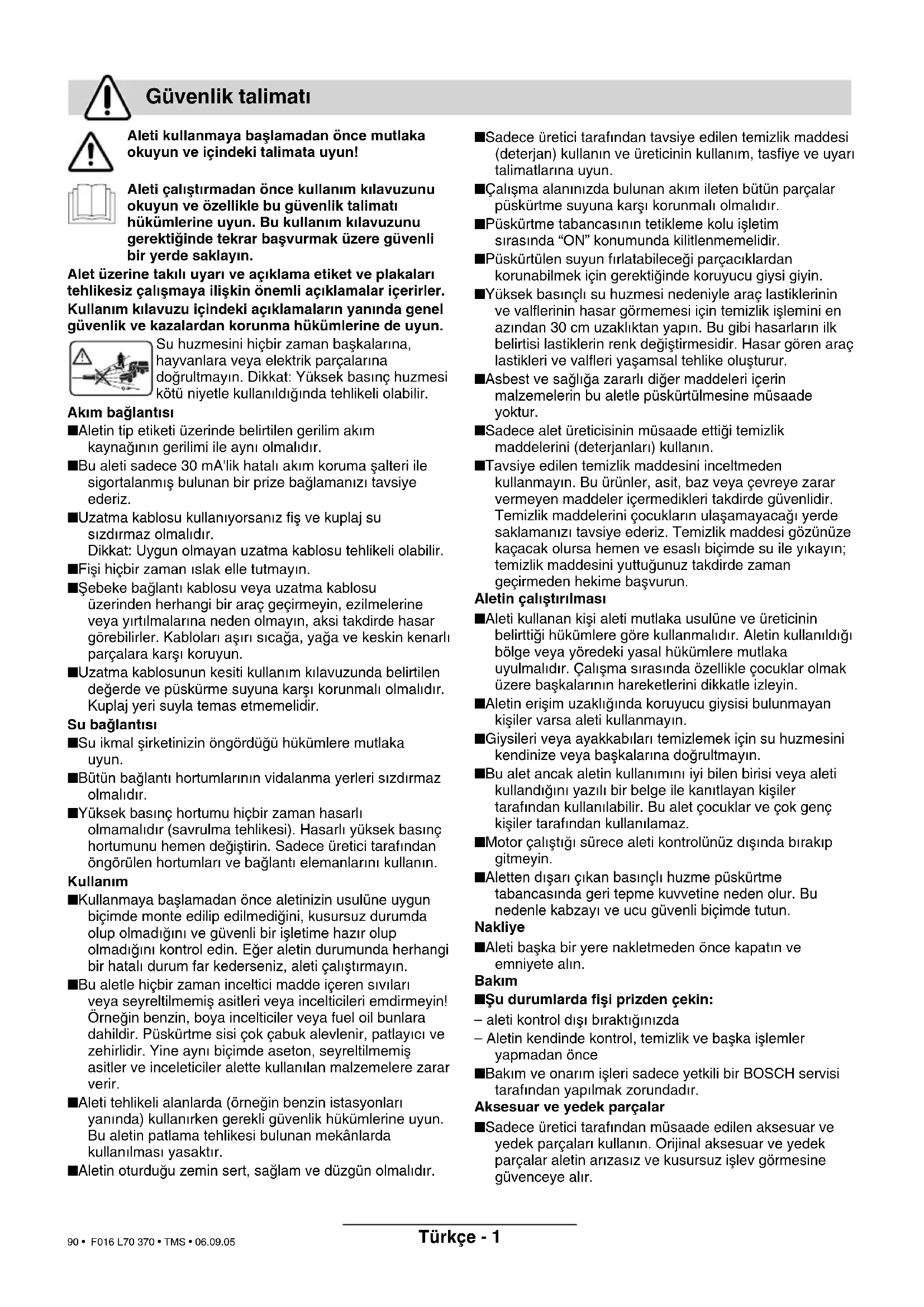 Υπηρεσία εξυπηρέτησης πελατών (Service) ∆ήλωση συµβατικ'τητας F016 L70 370.book Seite 7 Donnerstag, 29. September 2005 10:40 10 89 • F016 L70 370 • TMS • 06.09.05Türkçe - 1 Aleti kullanmaya baµlamadan önce mutlaka okuyun ve içindeki talimata uyun! Aleti çal∂µt∂rmadan önce kullan∂m k∂lavuzunu okuyun ve özellikle bu güvenlik talimat∂ hükümlerine uyun. Bu kullan∂m k∂lavuzunu gerektiπinde tekrar baµvurmak üzere güvenli bir yerde saklay∂n. Alet üzerine tak∂l∂ uyar∂ ve aç∂klama etiket ve plakalar∂ tehlikesiz çal∂µmaya iliµkin önemli aç∂klamalar içerirler. Kullan∂m k∂lavuzu içindeki aç∂klamalar∂n yan∂nda genel güvenlik ve kazalardan korunma hükümlerine de uyun. Su huzmesini hiçbir zaman baµkalar∂na, hayvanlara veya elektrik parçalar∂na doπrultmay∂n. Dikkat: Yüksek bas∂nç huzmesi kötü niyetle kullan∂ld∂π∂nda tehlikeli olabilir. Ak∂m baπlant∂s∂ ■ Aletin tip etiketi üzerinde belirtilen gerilim ak∂m kaynaπ∂n∂n gerilimi ile ayn∂ olmal∂d∂r. ■ Bu aleti sadece 30 mA'lik hatal∂ ak∂m koruma µalteri ile sigortalanm∂µ bulunan bir prize baπlaman∂z∂ tavsiye ederiz. ■ Uzatma kablosu kullan∂yorsan∂z fiµ ve kuplaj su s∂zd∂rmaz olmal∂d∂r. Dikkat: Uygun olmayan uzatma kablosu tehlikeli olabilir. ■ Fiµi hiçbir zaman ∂slak elle tutmay∂n. ■ Ωebeke baπlant∂ kablosu veya uzatma kablosu üzerinden herhangi bir araç geçirmeyin, ezilmelerine veya y∂rt∂lmalar∂na neden olmay∂n, aksi takdirde hasar görebilirler. Kablolar∂ aµ∂r∂ s∂caπa, yaπa ve keskin kenarl∂ parçalara karµ∂ koruyun. ■ Uzatma kablosunun kesiti kullan∂m k∂lavuzunda belirtilen deπerde ve püskürme suyuna karµ∂ korunmal∂ olmal∂d∂r. Kuplaj yeri suyla temas etmemelidir. Su baπlant∂s∂ ■ Su ikmal µirketinizin öngördüπü hükümlere mutlaka uyun. ■ Bütün baπlant∂ hortumlar∂n∂n vidalanma yerleri s∂zd∂rmaz olmal∂d∂r. ■ Yüksek bas∂nç hortumu hiçbir zaman hasarl∂ olmamal∂d∂r (savrulma tehlikesi). Hasarl∂ yüksek bas∂nç hortumunu hemen deπiµtirin. Sadece üretici taraf∂ndan öngörülen hortumlar∂ ve baπlant∂ elemanlar∂n∂ kullan∂n. Kullan∂m ■ Kullanmaya baµlamadan önce aletinizin usulüne uygun biçimde monte edilip edilmediπini, kusursuz durumda olup olmad∂π∂n∂ ve güvenli bir iµletime haz∂r olup olmad∂π∂n∂ kontrol edin. Eπer aletin durumunda herhangi bir hatal∂ durum far kederseniz, aleti çal∂µt∂rmay∂n. ■ Bu aletle hiçbir zaman inceltici madde içeren s∂v∂lar∂ veya seyreltilmemiµ asitleri veya incelticileri emdirmeyin! Örneπin benzin, boya incelticiler veya fuel oil bunlara dahildir. Püskürtme sisi çok çabuk alevlenir, patlay∂c∂ ve zehirlidir. Yine ayn∂ biçimde aseton, seyreltilmemiµ asitler ve inceleticiler alette kullan∂lan malzemelere zarar verir. ■ Aleti tehlikeli alanlarda (örneπin benzin istasyonlar∂ yan∂nda) kullan∂rken gerekli güvenlik hükümlerine uyun. Bu aletin patlama tehlikesi bulunan mekânlarda kullan∂lmas∂ yasakt∂r. ■ Aletin oturduπu zemin sert, saπlam ve düzgün olmal∂d∂r. ■ Sadece üretici taraf∂ndan tavsiye edilen temizlik maddesi (deterjan) kullan∂n ve üreticinin kullan∂m, tasfiye ve uyar∂ talimatlar∂na uyun. ■ Çal∂µma alan∂n∂zda bulunan ak∂m ileten bütün parçalar püskürtme suyuna karµ∂ korunmal∂ olmal∂d∂r. ■ Püskürtme tabancas∂n∂n tetikleme kolu iµletim s∂ras∂nda “ON” konumunda kilitlenmemelidir. ■ Püskürtülen suyun f∂rlatabileceπi parçac∂klardan korunabilmek için gerektiπinde koruyucu giysi giyin. ■ Yüksek bas∂nçl∂ su huzmesi nedeniyle araç lastiklerinin ve valflerinin hasar görmemesi için temizlik iµlemini en az∂ndan 30 cm uzakl∂ktan yap∂n. Bu gibi hasarlar∂n ilk belirtisi lastiklerin renk deπiµtirmesidir. Hasar gören araç lastikleri ve valfleri yaµamsal tehlike oluµturur. ■ Asbest ve saπl∂πa zararl∂ diπer maddeleri içerin malzemelerin bu aletle püskürtülmesine müsaade yoktur. ■ Sadece alet üreticisinin müsaade ettiπi temizlik maddelerini (deterjanlar∂) kullan∂n. ■ Tavsiye edilen temizlik maddesini inceltmeden kullanmay∂n. Bu ürünler, asit, baz veya çevreye zarar vermeyen maddeler içermedikleri takdirde güvenlidir. Temizlik maddelerini çocuklar∂n ulaµamayacaπ∂ yerde saklaman∂z∂ tavsiye ederiz. Temizlik maddesi gözünüze kaçacak olursa hemen ve esasl∂ biçimde su ile y∂kay∂n; temizlik maddesini yuttuπunuz takdirde zaman geçirmeden hekime baµvurun. Aletin çal∂µt∂r∂lmas∂ ■ Aleti kullanan kiµi aleti mutlaka usulüne ve üreticinin belirttiπi hükümlere göre kullanmal∂d∂r. Aletin kullan∂ld∂π∂ bölge veya yöredeki yasal hükümlere mutlaka uyulmal∂d∂r. Çal∂µma s∂ras∂nda özellikle çocuklar olmak üzere baµkalar∂n∂n hareketlerini dikkatle izleyin. ■ Aletin eriµim uzakl∂π∂nda koruyucu giysisi bulunmayan kiµiler varsa aleti kullanmay∂n. ■ Giysileri veya ayakkab∂lar∂ temizlemek için su huzmesini kendinize veya baµkalar∂na doπrultmay∂n. ■ Bu alet ancak aletin kullan∂m∂n∂ iyi bilen birisi veya aleti kulland∂π∂n∂ yaz∂l∂ bir belge ile kan∂tlayan kiµiler taraf∂ndan kullan∂labilir. Bu alet çocuklar ve çok genç kiµiler taraf∂ndan kullan∂lamaz. ■ Motor çal∂µt∂π∂ sürece aleti kontrolünüz d∂µ∂nda b∂rak∂p gitmeyin. ■ Aletten d∂µar∂ ç∂kan bas∂nçl∂ huzme püskürtme tabancas∂nda geri tepme kuvvetine neden olur. Bu nedenle kabzay∂ ve ucu güvenli biçimde tutun. Nakliye ■ Aleti baµka bir yere nakletmeden önce kapat∂n ve emniyete al∂n. Bak∂m ■ Ωu durumlarda fiµi prizden çekin: – aleti kontrol d∂µ∂ b∂rakt∂π∂n∂zda – Aletin kendinde kontrol, temizlik