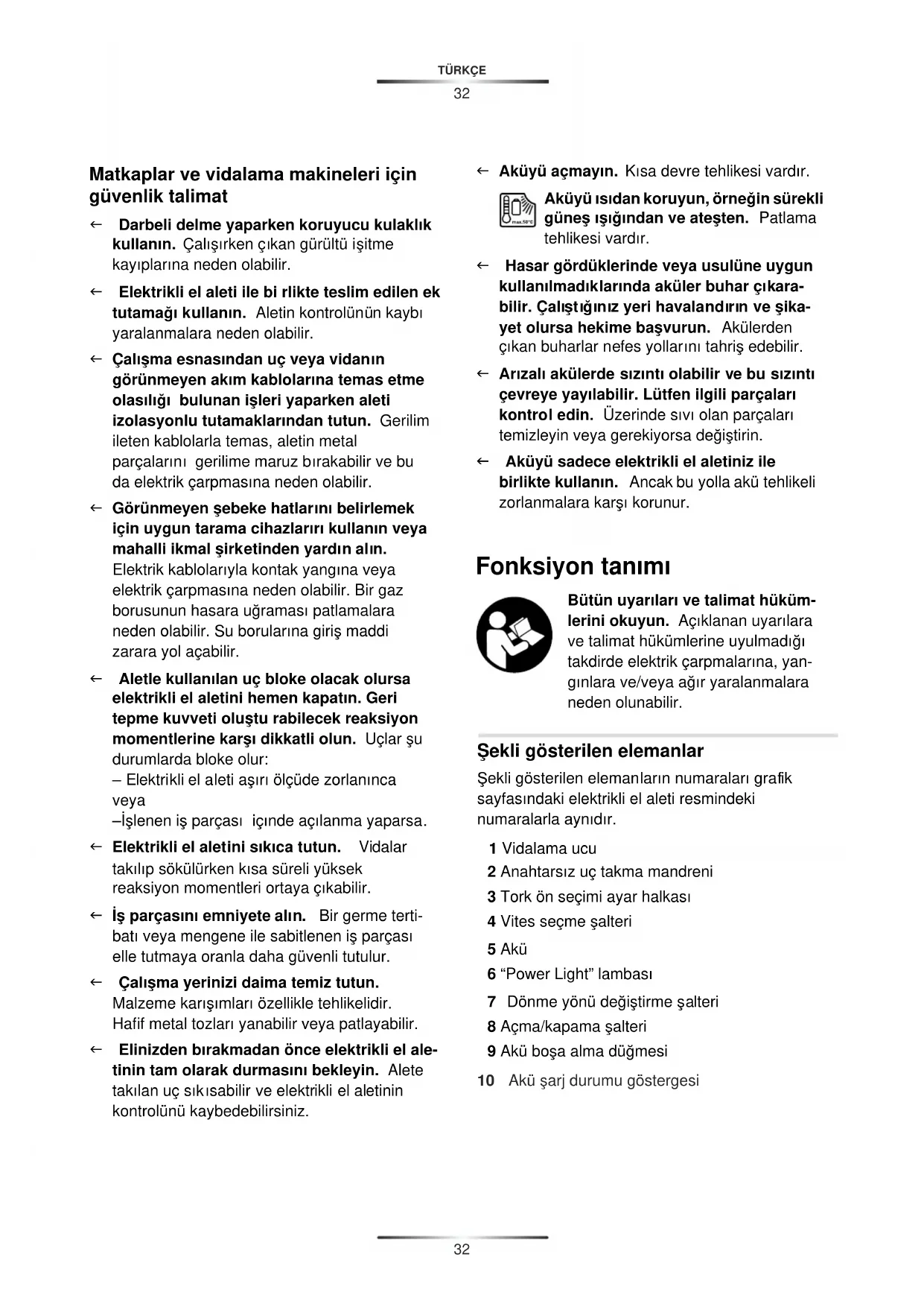 ← Sadece aksesuar sayfasinda belirtilen sarj cihazlarini kullanin. Sadece bu sarj cihazlarElektrikli el aletinizde kullanlan Li-ilonen akulere uygundur.
